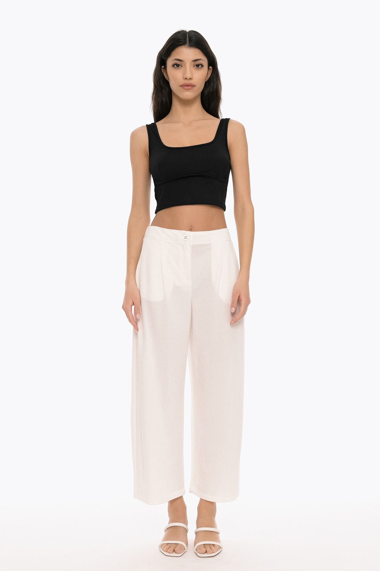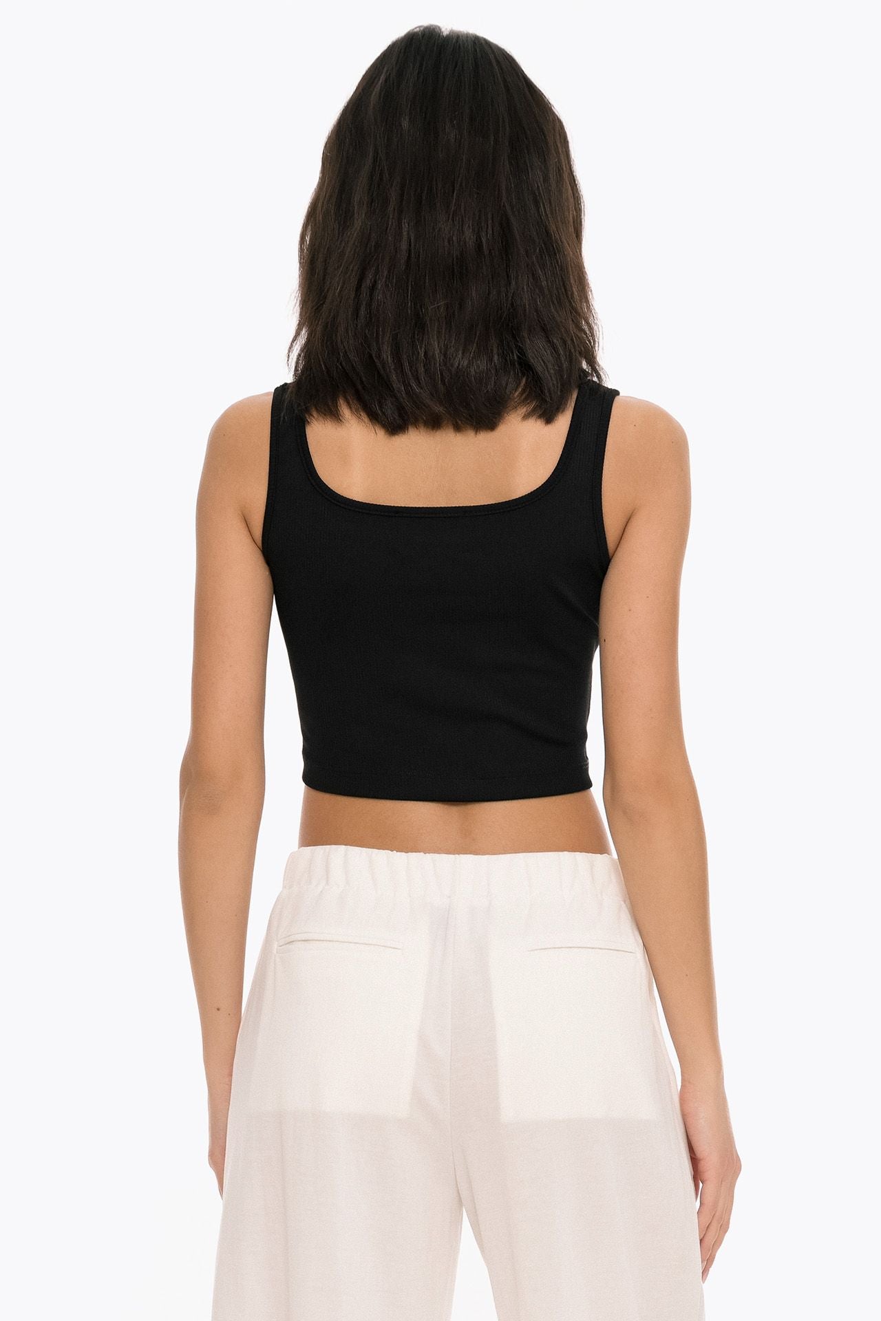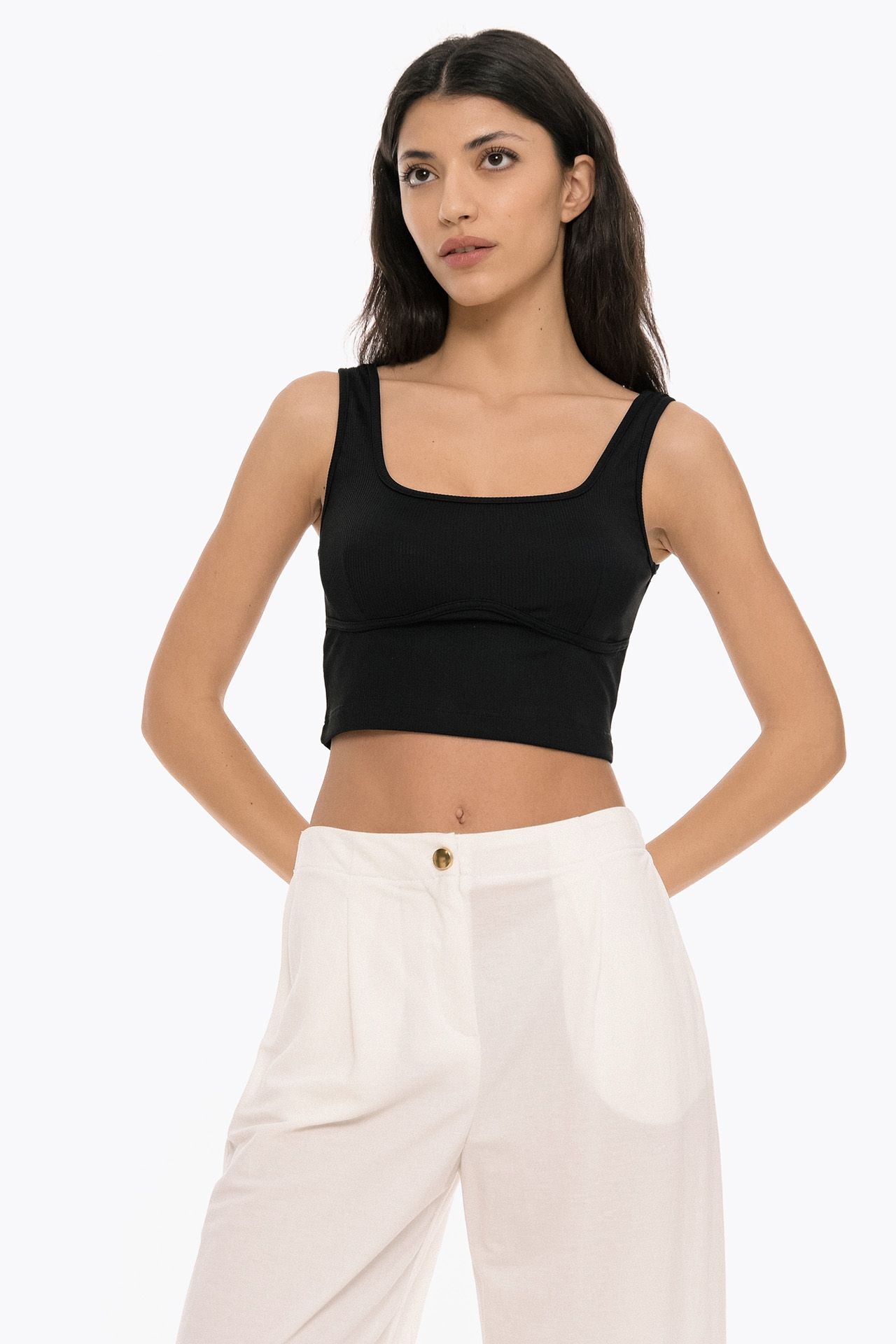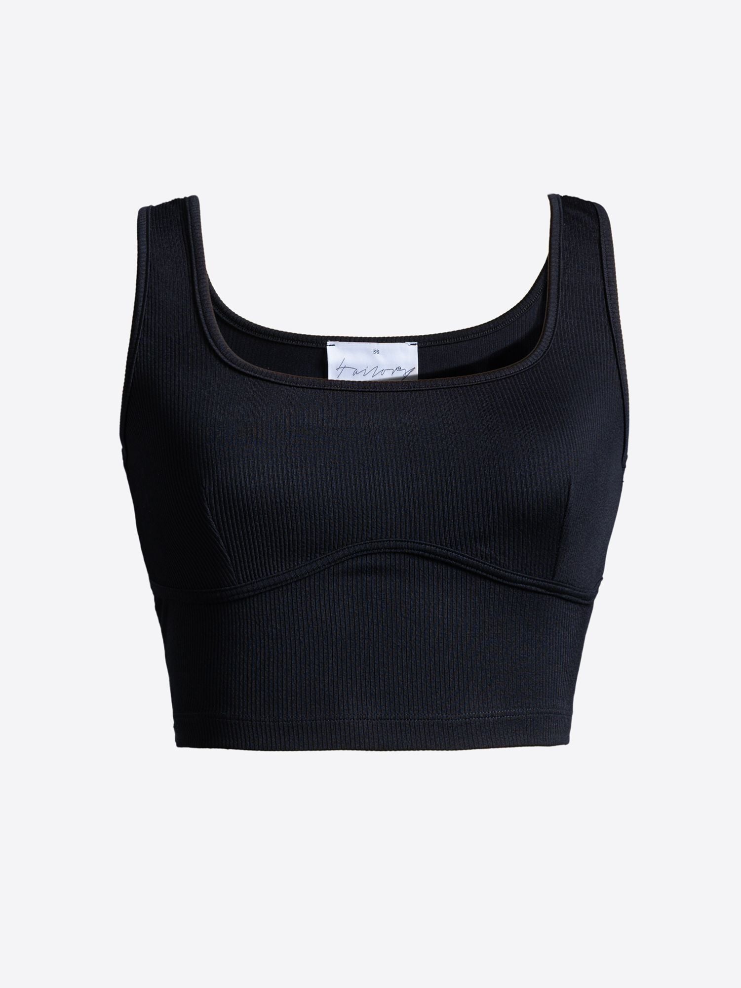 The After Ring Top is a sleeveless crop top featuring a binding under the chest that defines the bust and enhances the silhouette, combining comfort with a flattering fit.