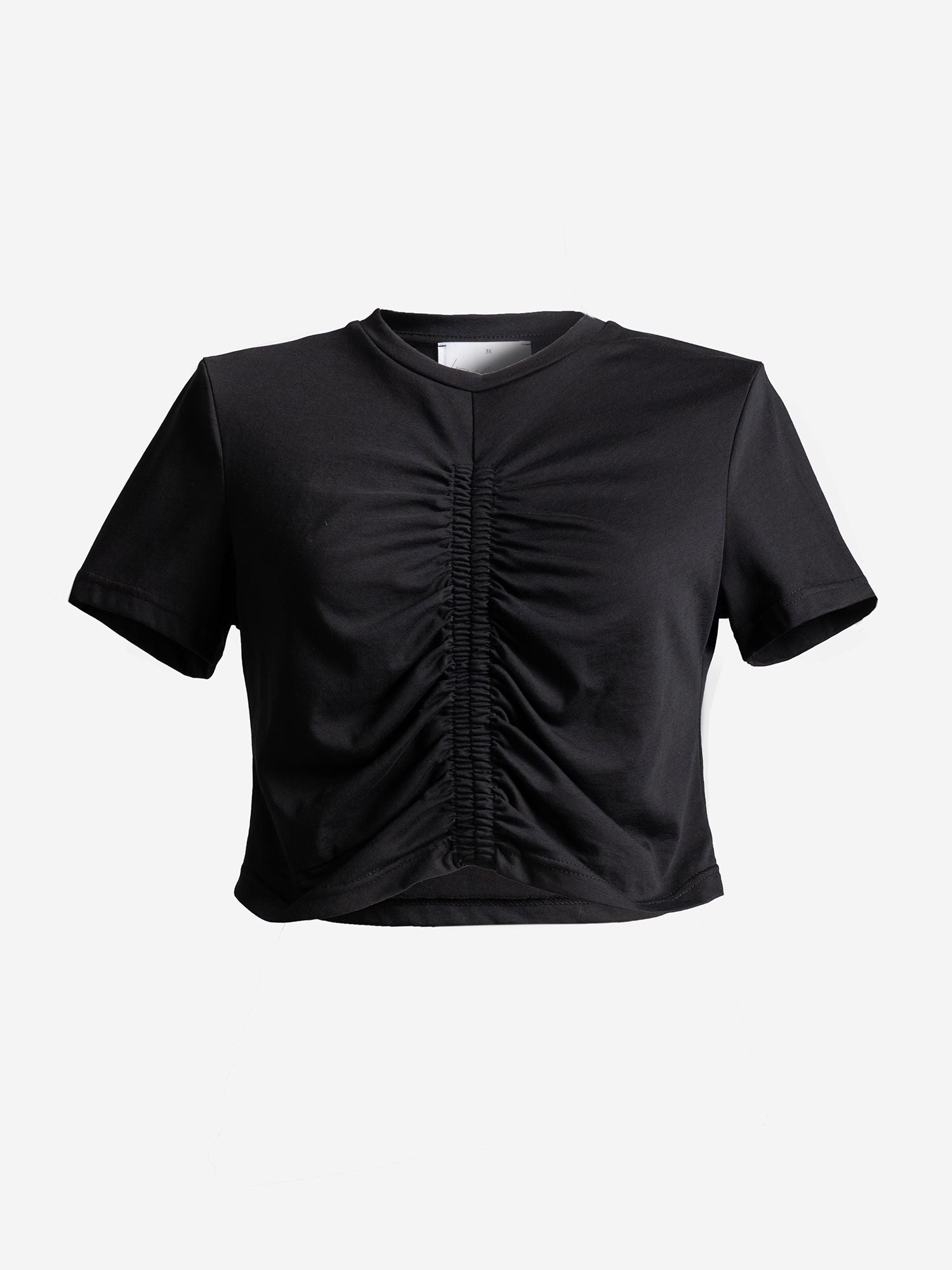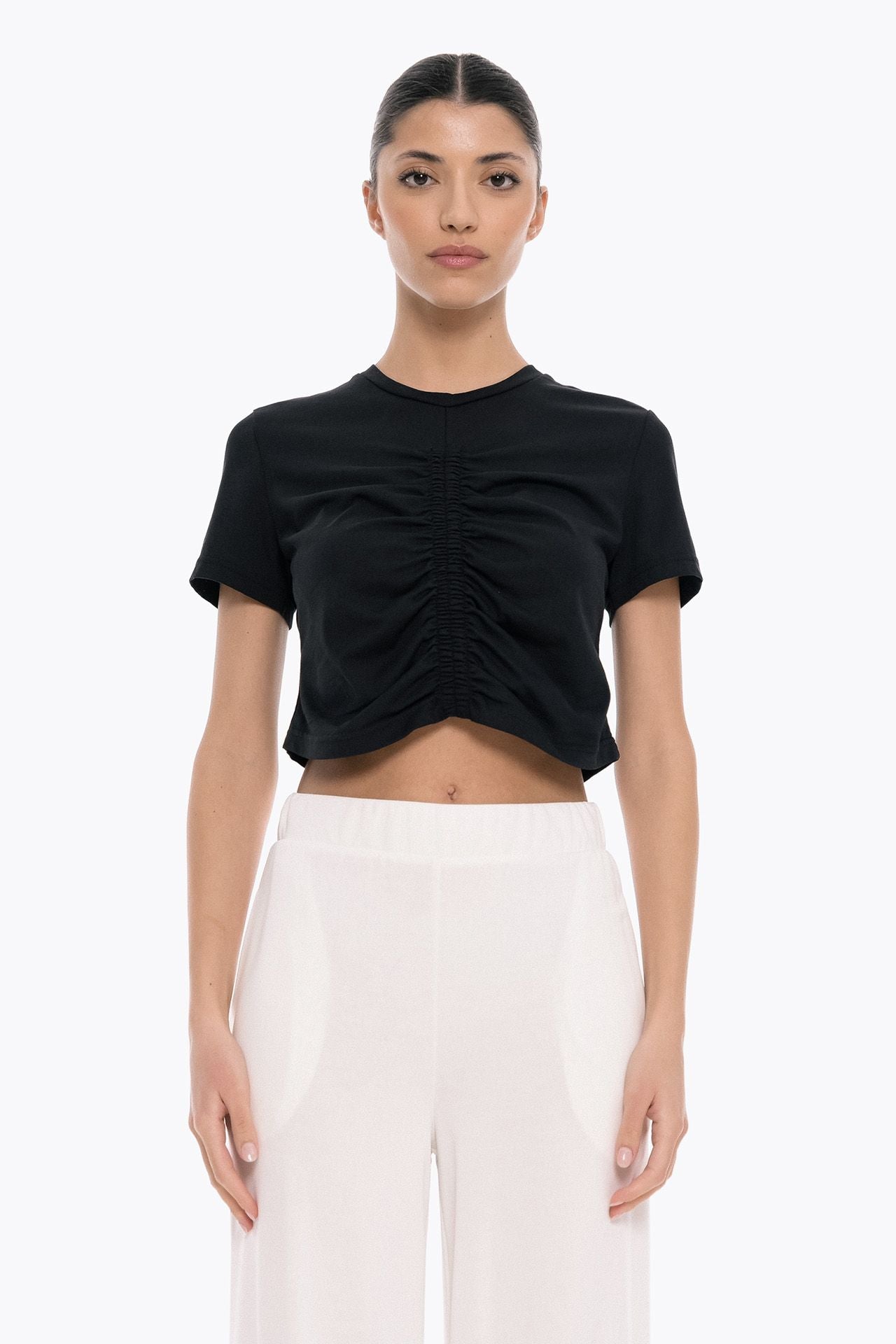 The Connect Me Crop Top features a decorative vertical elastic at the front, giving it a unique and distinctive look. With short sleeves and crafted from soft jersey fabric, it’s a versatile piece perfect for everyday wear.