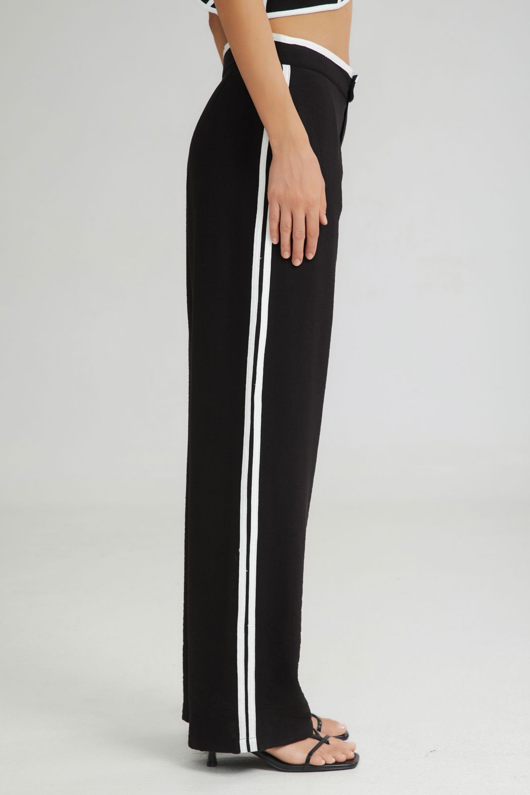 The Sundae Wide Pants Black, is a high-waisted pair of trousers with stripes and side pockets that radiate 90s vibes. Rock it with our Sundae Top Beige for a trendy look.