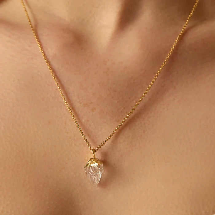 A clear quartz pendant held by a slim chain. The irregular gold setting, applied by hand, wraps the crystal like liquid metal, highlighting its raw, organic beauty. Each stone is one of a kind — naturally cut with subtle differences in shape and facets, similar in size but never identical.