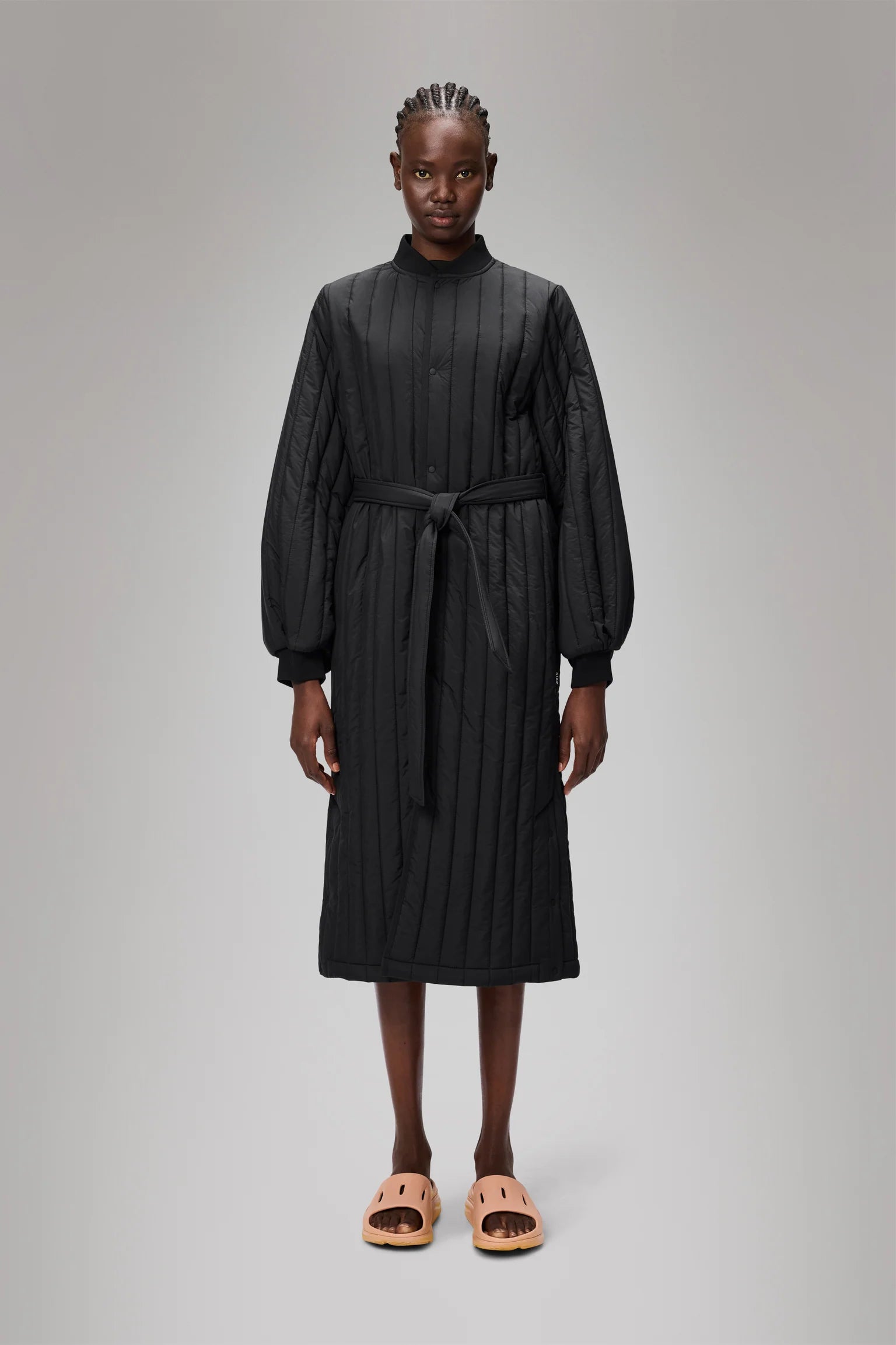 Banja Liner W Coat is a long-coat silhouette in a female fit. The liner has a clean aesthetic with light padding and a belt at waist.
