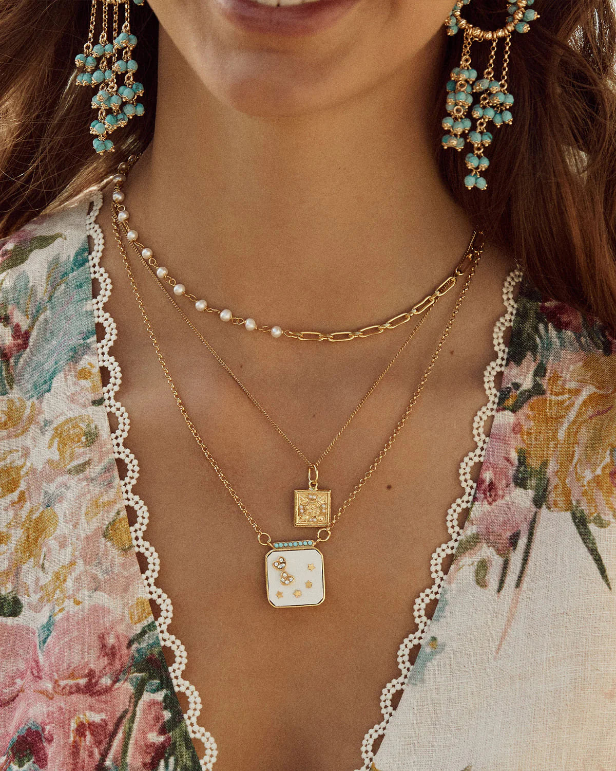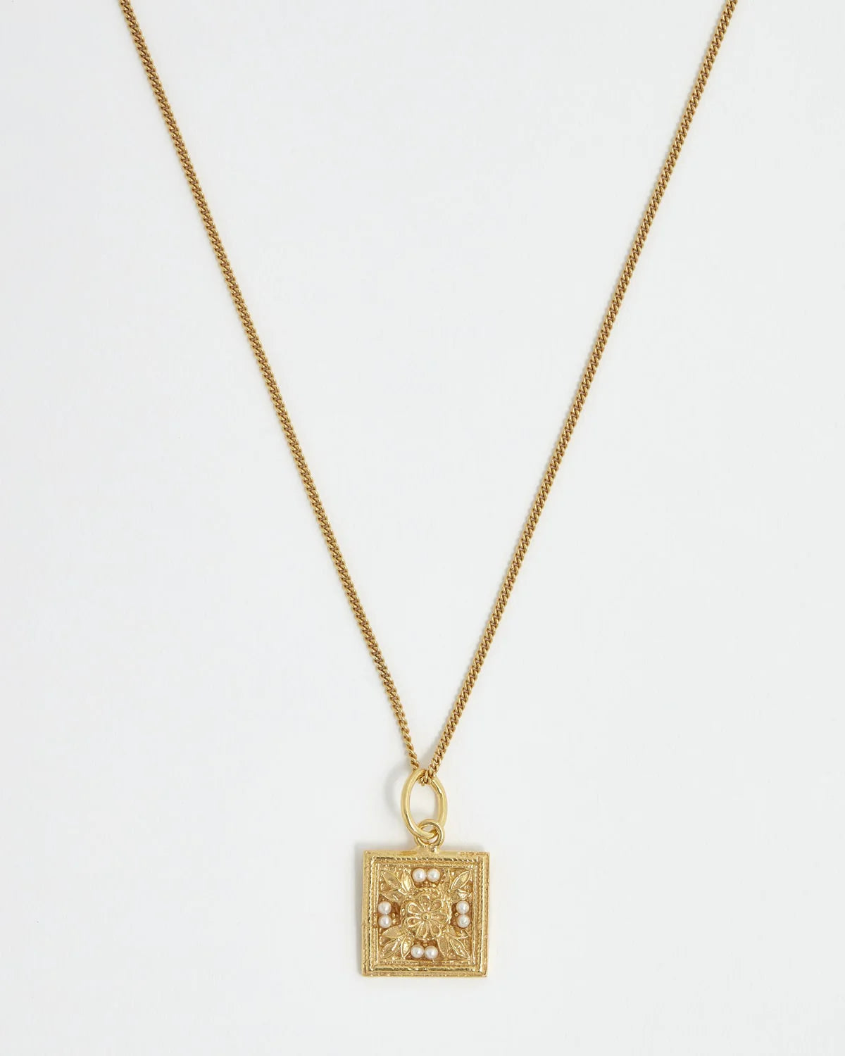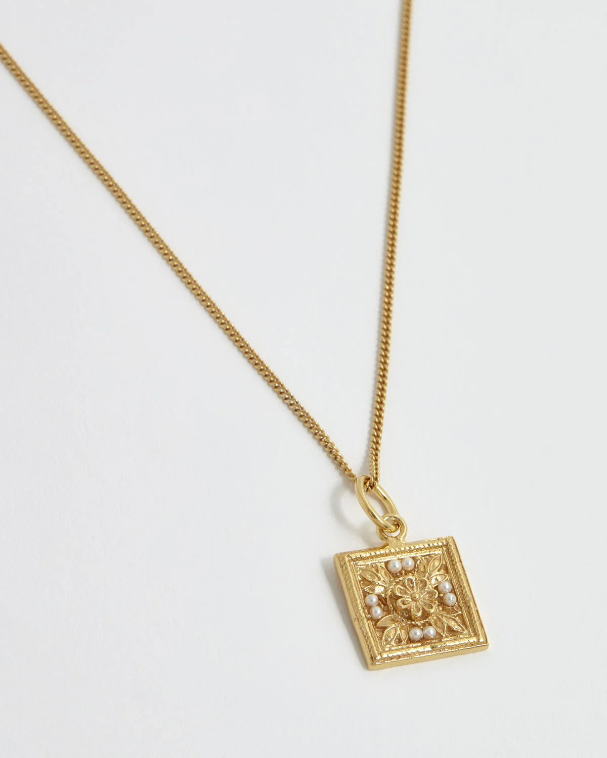 This dainty necklace features a mini square-shaped pendant, embellished with a pearl floral design and an organic finish. Perfect for wearing alone, or as part of a stack with other necklaces.