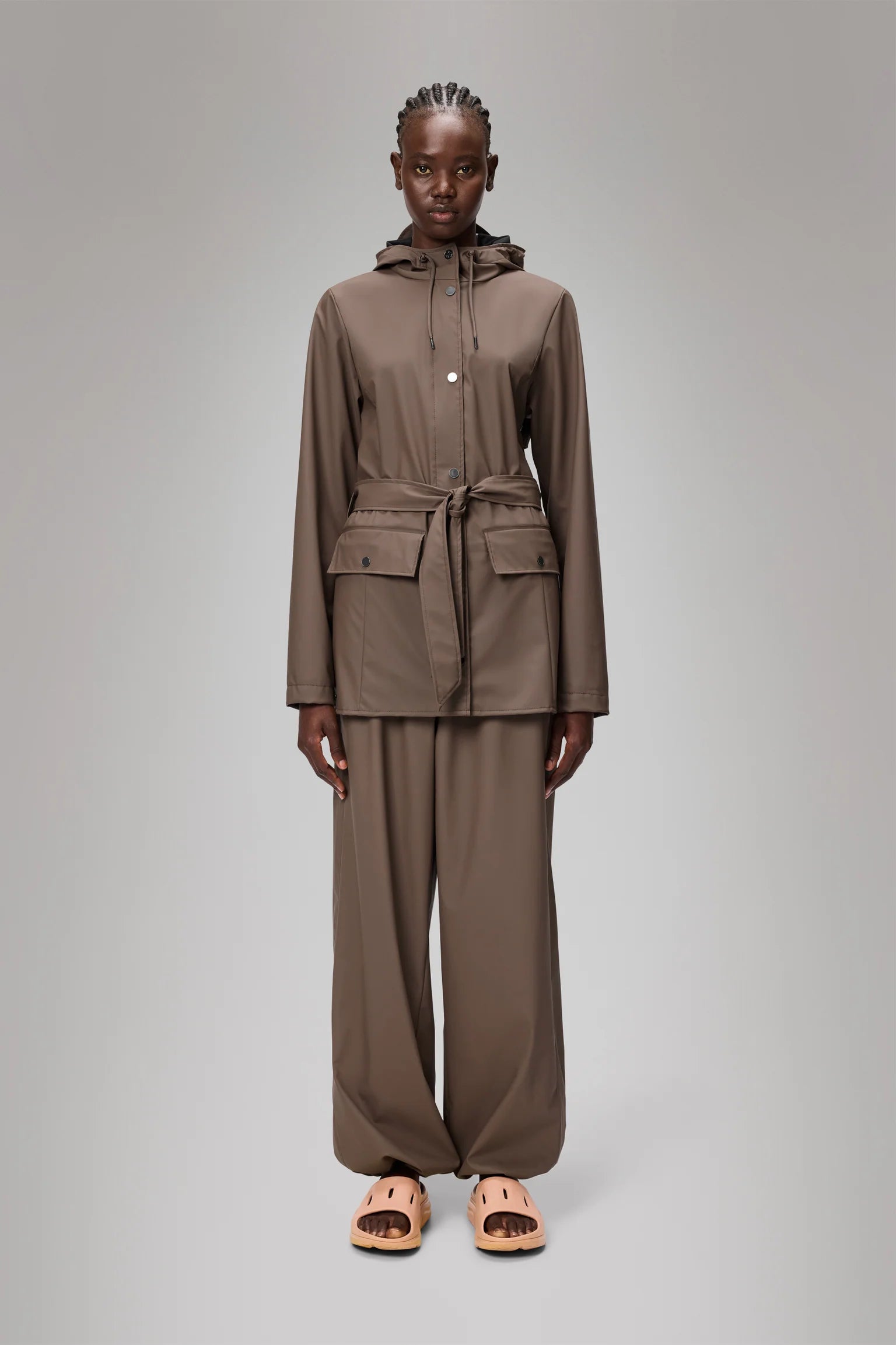 This design is a clean women's raincoat with a minimal aesthetic. The fit is figure-flattering with high functionality.