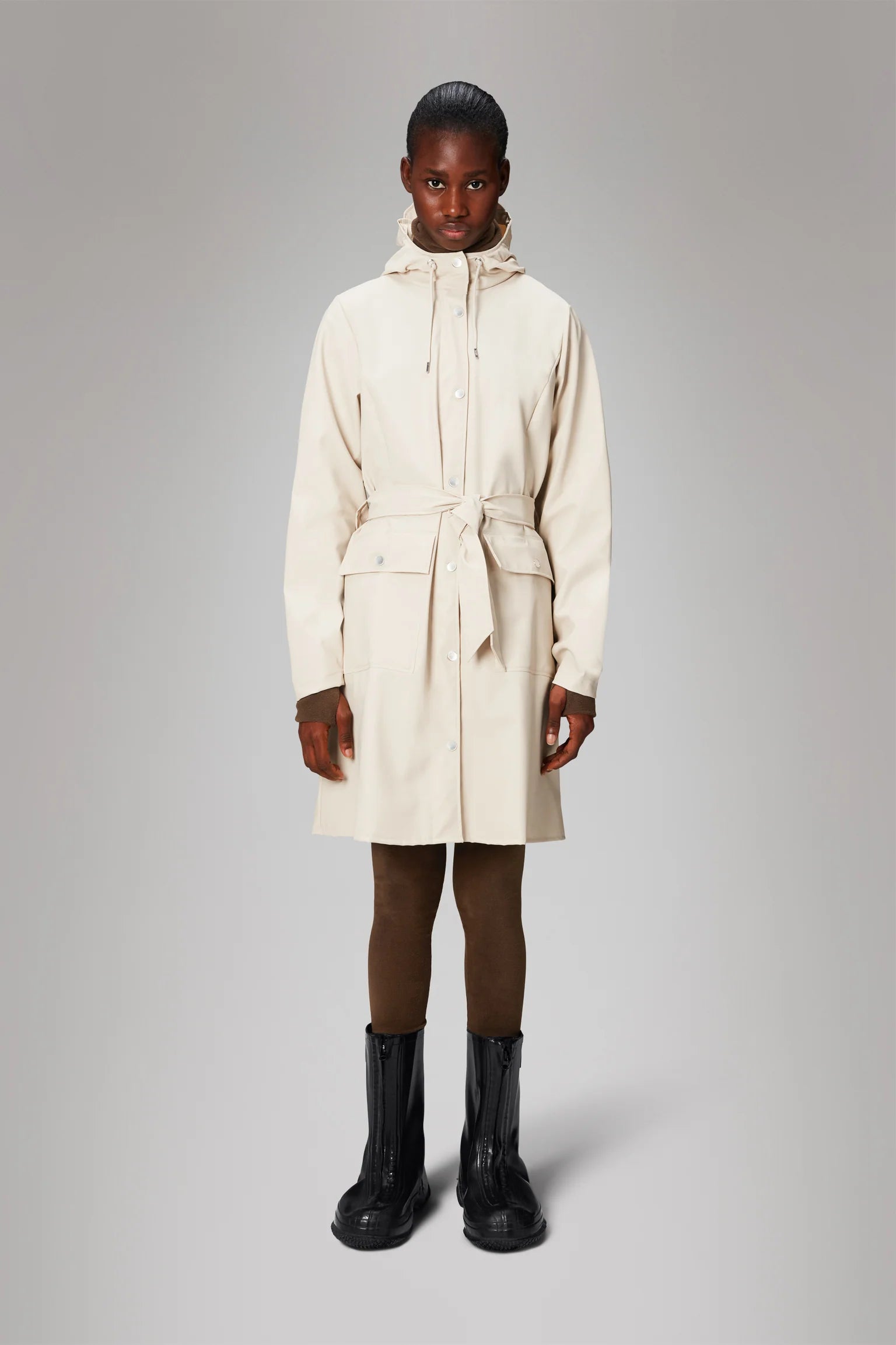Curve Jacket is a shorter version of Rains' Curve Long Jacket with a belt that elegantly accentuates the waist. Designed to block out water, wind and chill.