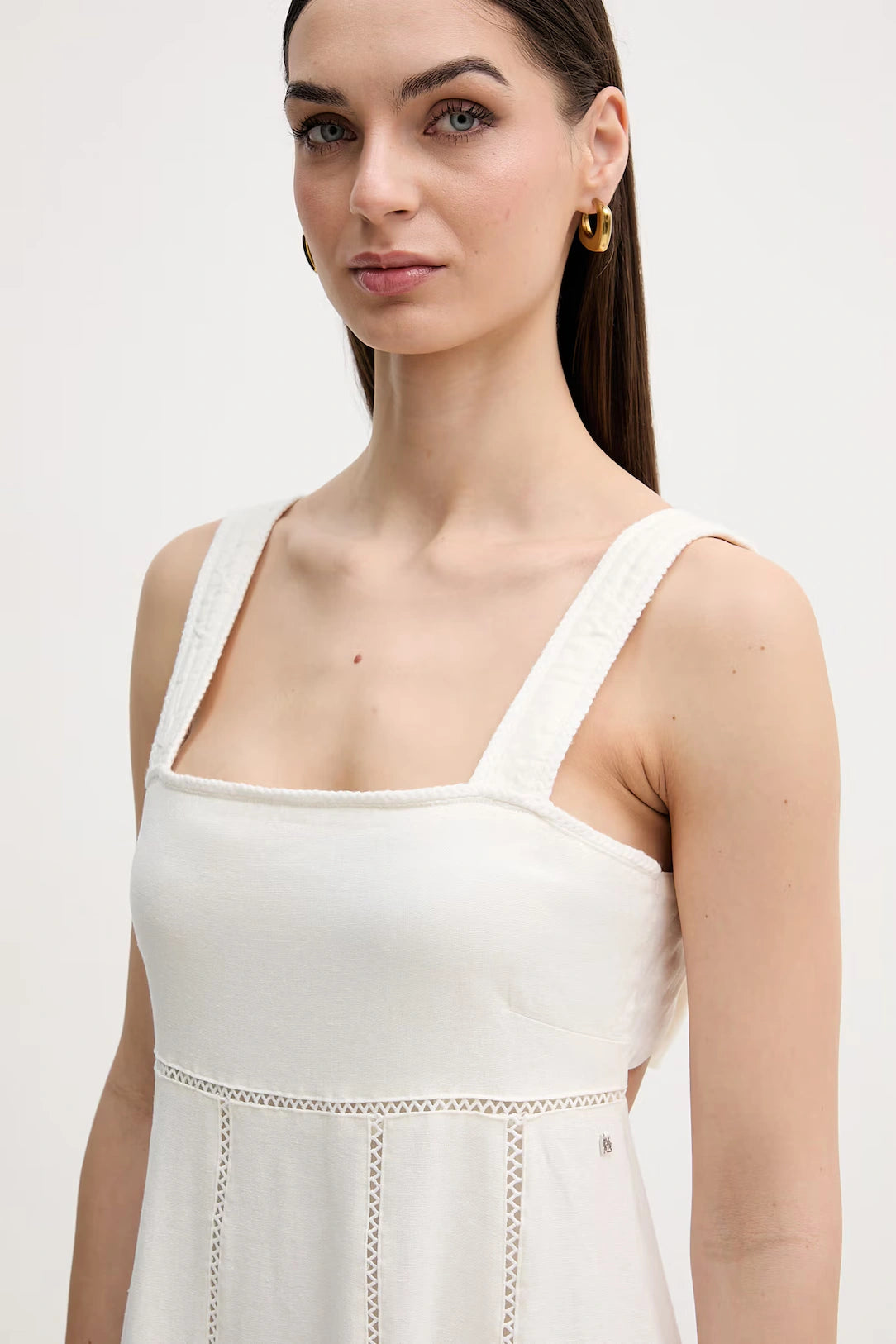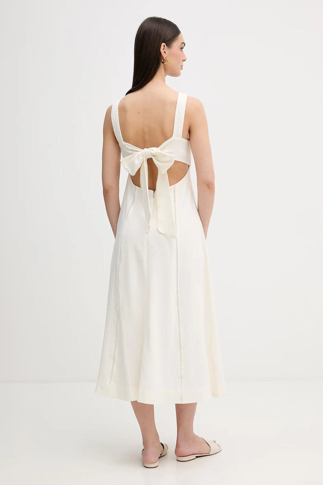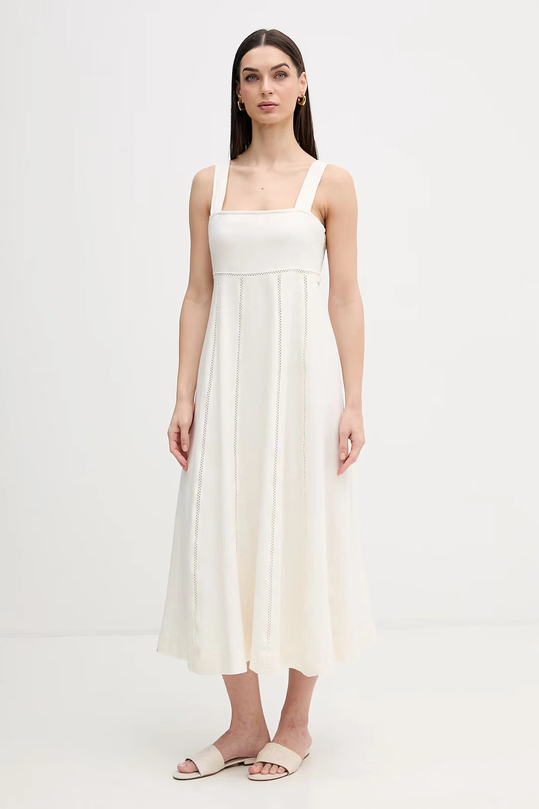 Designed with wide shoulder straps and a flattering square neckline, the dress flows into a softly structured A-line skirt that falls to a graceful midi length. Delicate vertical lace inserts subtly elongate the silhouette, while the open back with a statement bow detail adds a romantic, contemporary twist. The discreet DKNY logo hardware offers a refined signature finish.