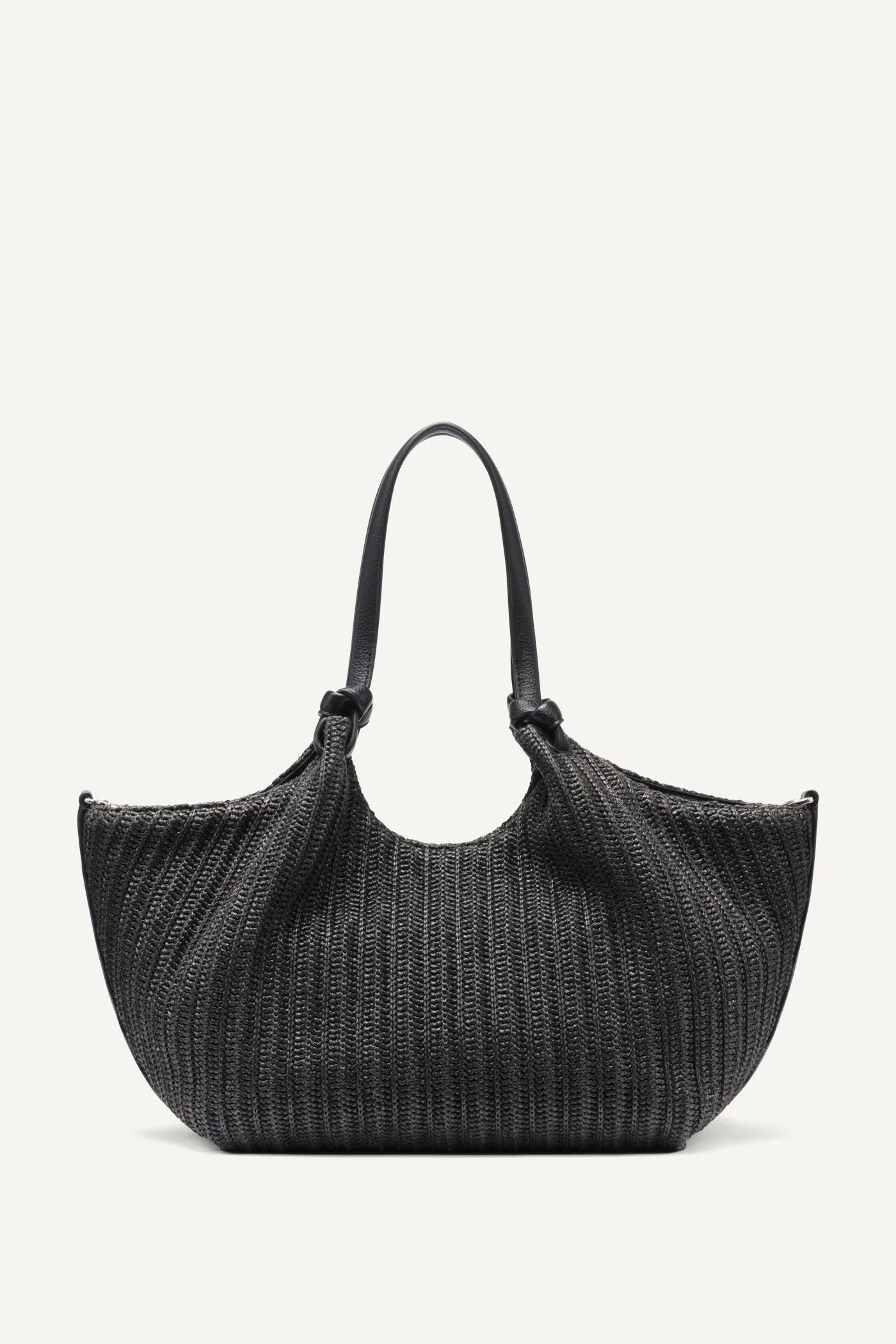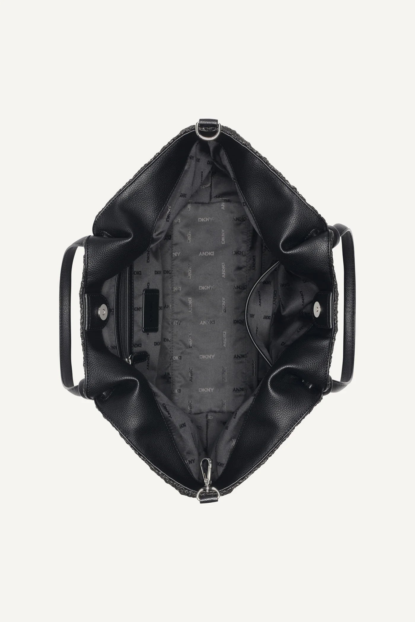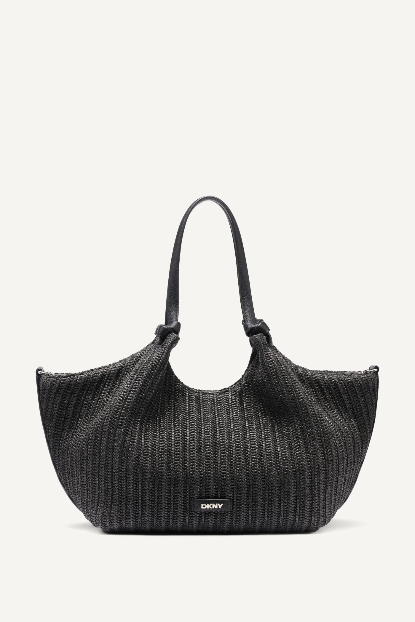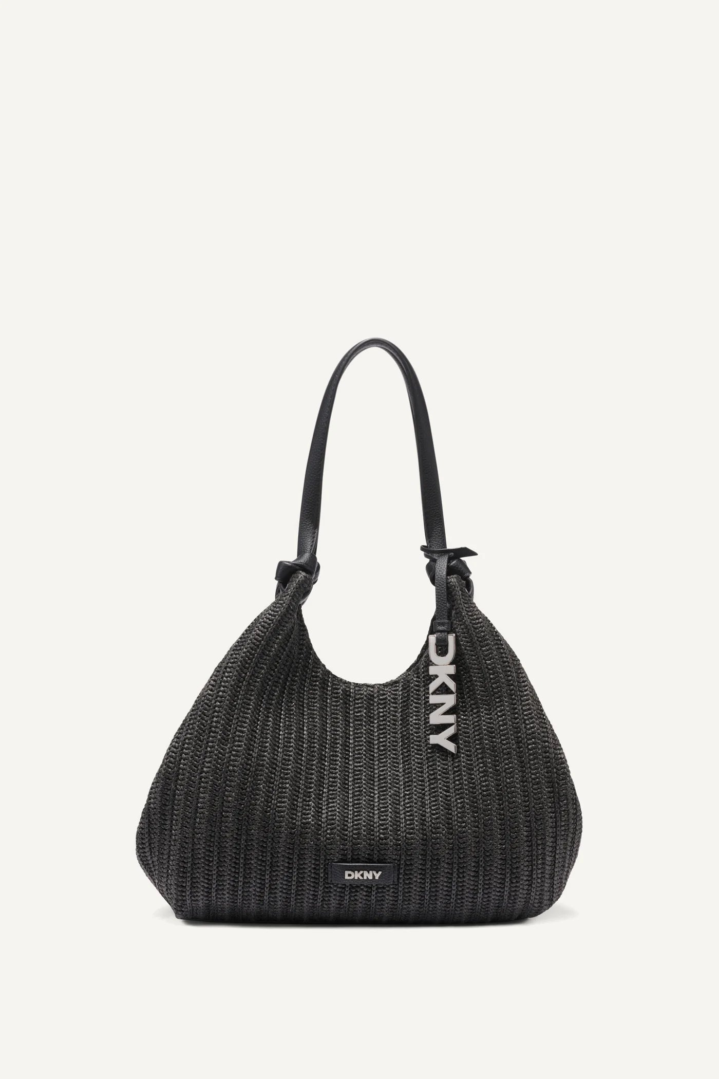 Crafted with a structured raffia-style weave, the bag features elegant black leather shoulder straps for comfortable wear and durability. The sleek DKNY logo plaque and metallic DKNY charm add a subtle designer signature while keeping the overall look clean and sophisticated.