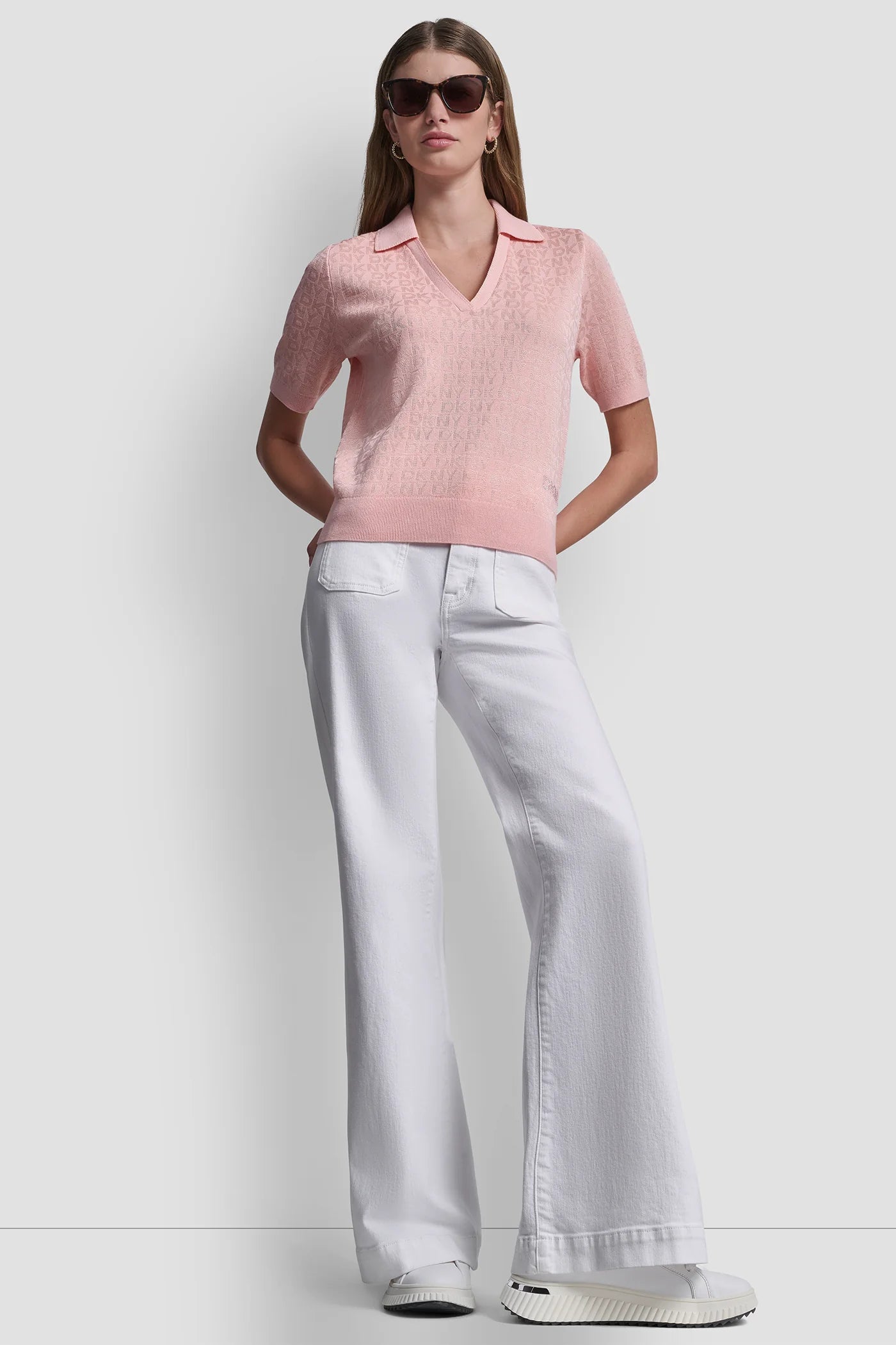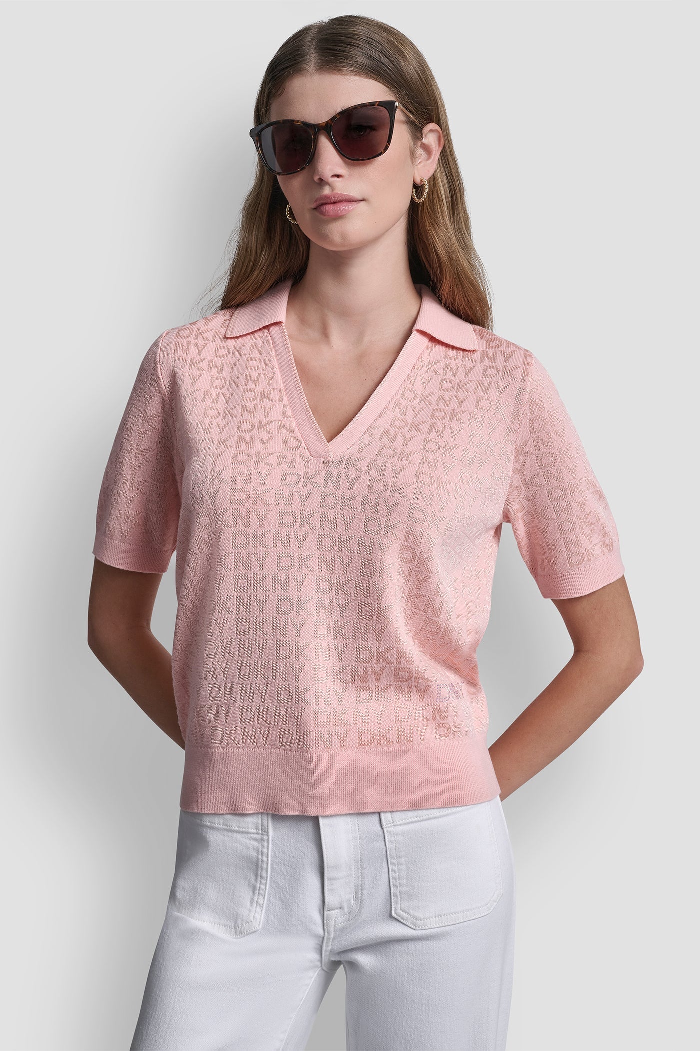 Polished with a touch of sparkle, this elbow-sleeve polo sweater features a rhinestone DKNY logo for refined shine. Crafted in a soft cotton-blend knit, it delivers breathable comfort with an elevated, modern finish.