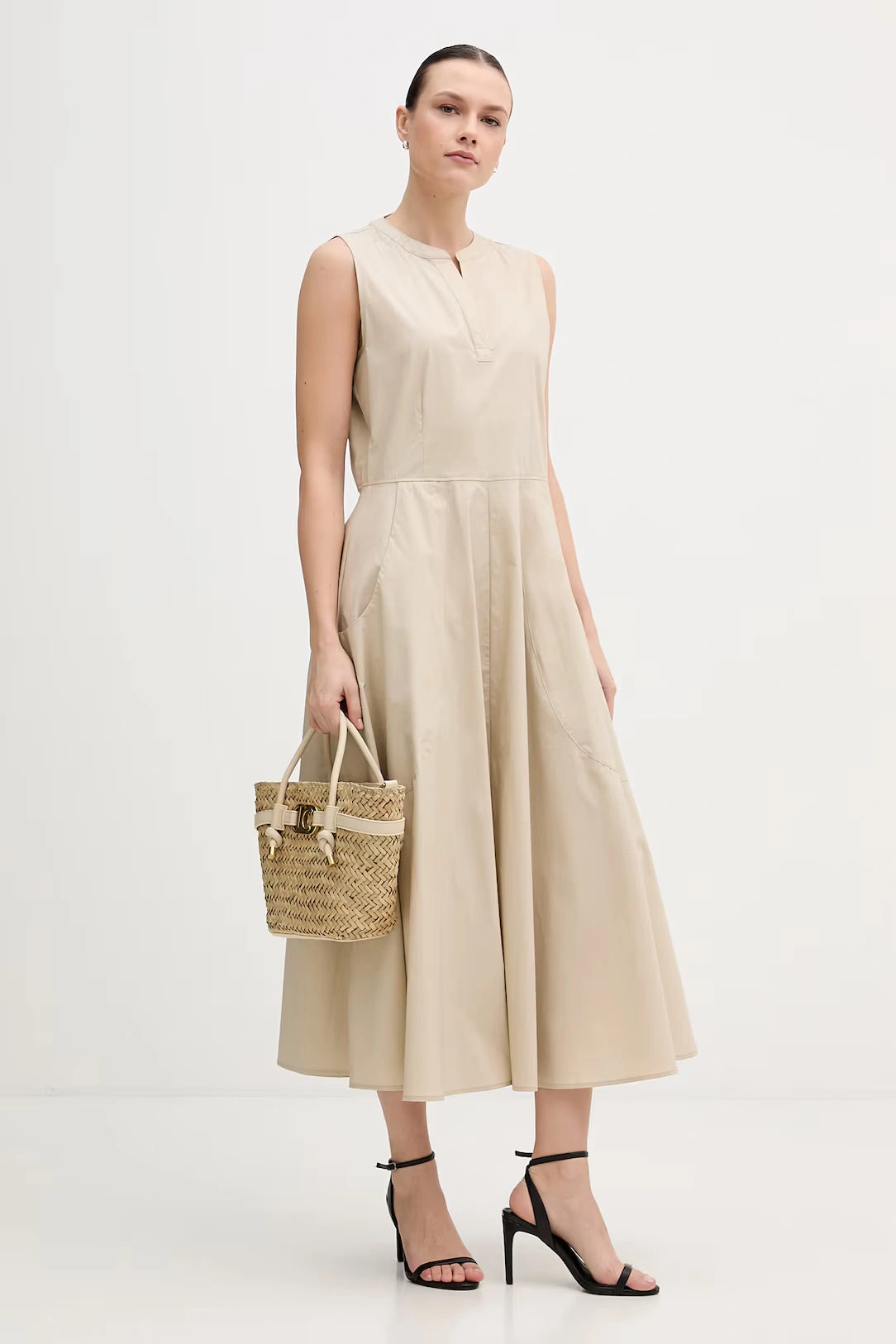 Crafted from lightweight cotton fabric, it features a sleeveless cut with a clean split neckline that enhances its minimalist aesthetic. The fitted bodice flows into a softly flared midi skirt, creating graceful movement and a flattering shape. Practical side pockets add a functional, urban touch—true to DKNY’s modern city spirit.
