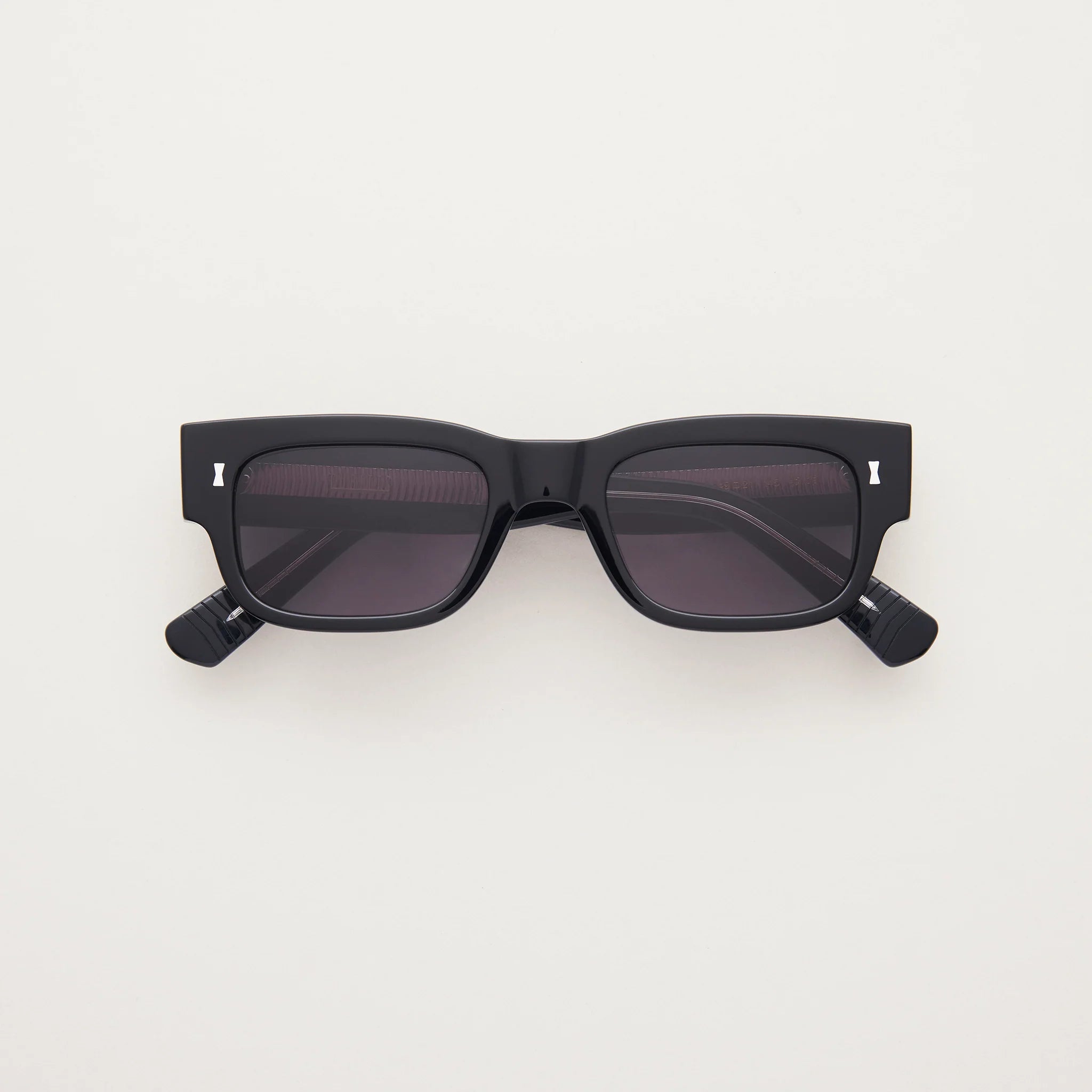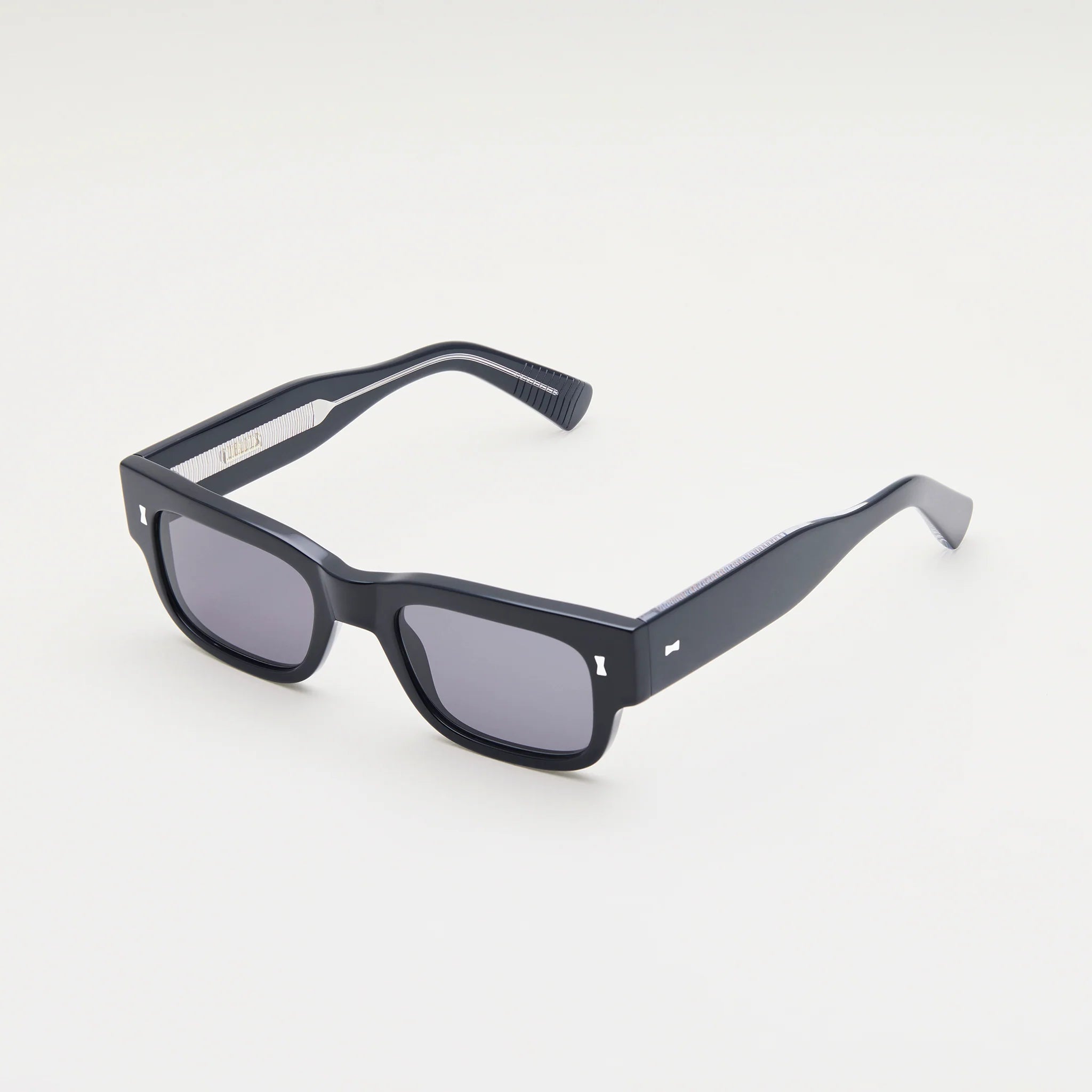 Angular and compact. A narrow boxy silhouette with a shallow rectangular lens, sharply cornered lugs and a blocky saddle bridge. Temples which taper from 18 to 6mm, culminating in an angular grooved tip. Outwardly reserved with a spirit of cool.