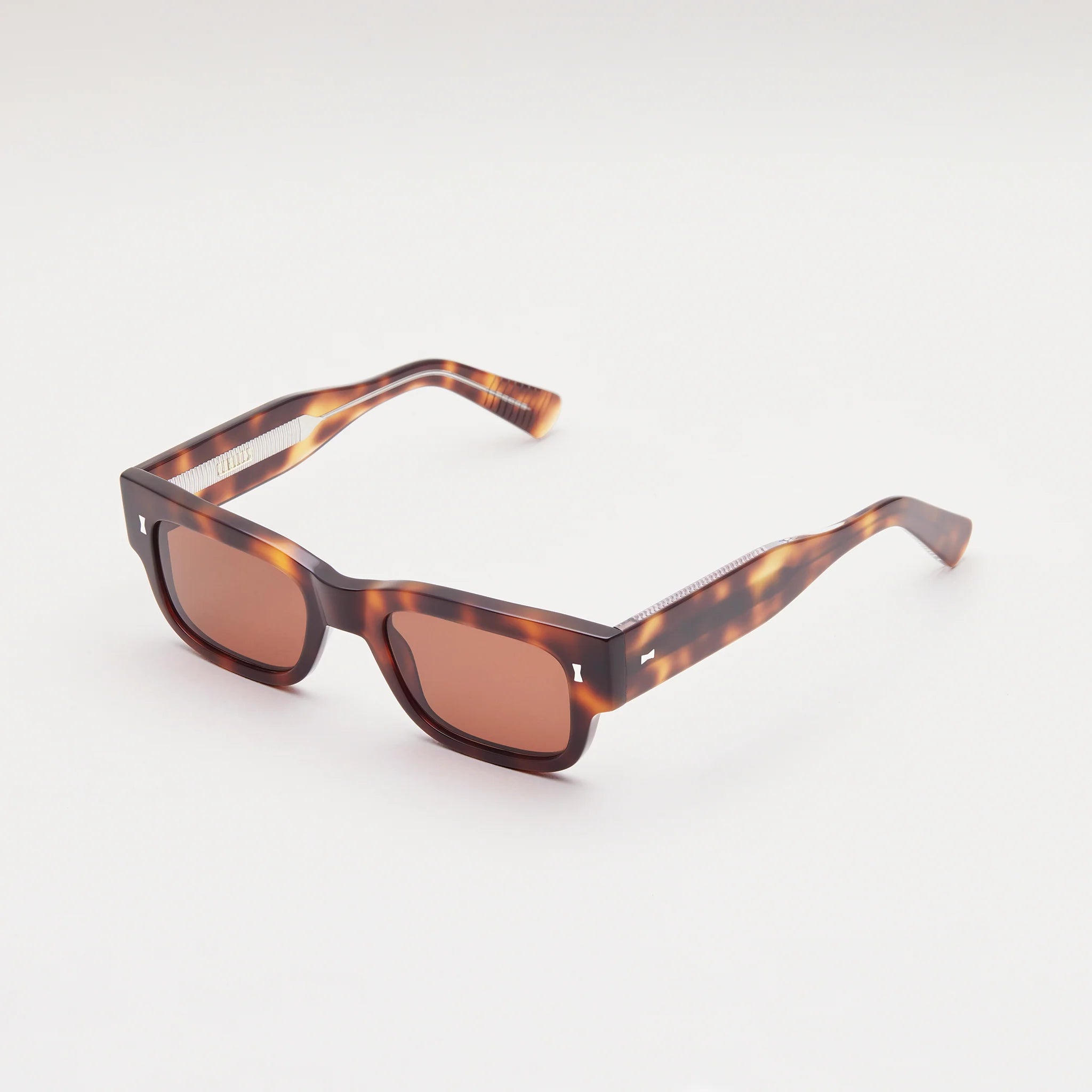 Angular and compact. A narrow boxy silhouette with a shallow rectangular lens, sharply cornered lugs and a blocky saddle bridge. Temples which taper from 18 to 6mm, culminating in an angular grooved tip. Outwardly reserved with a spirit of cool.