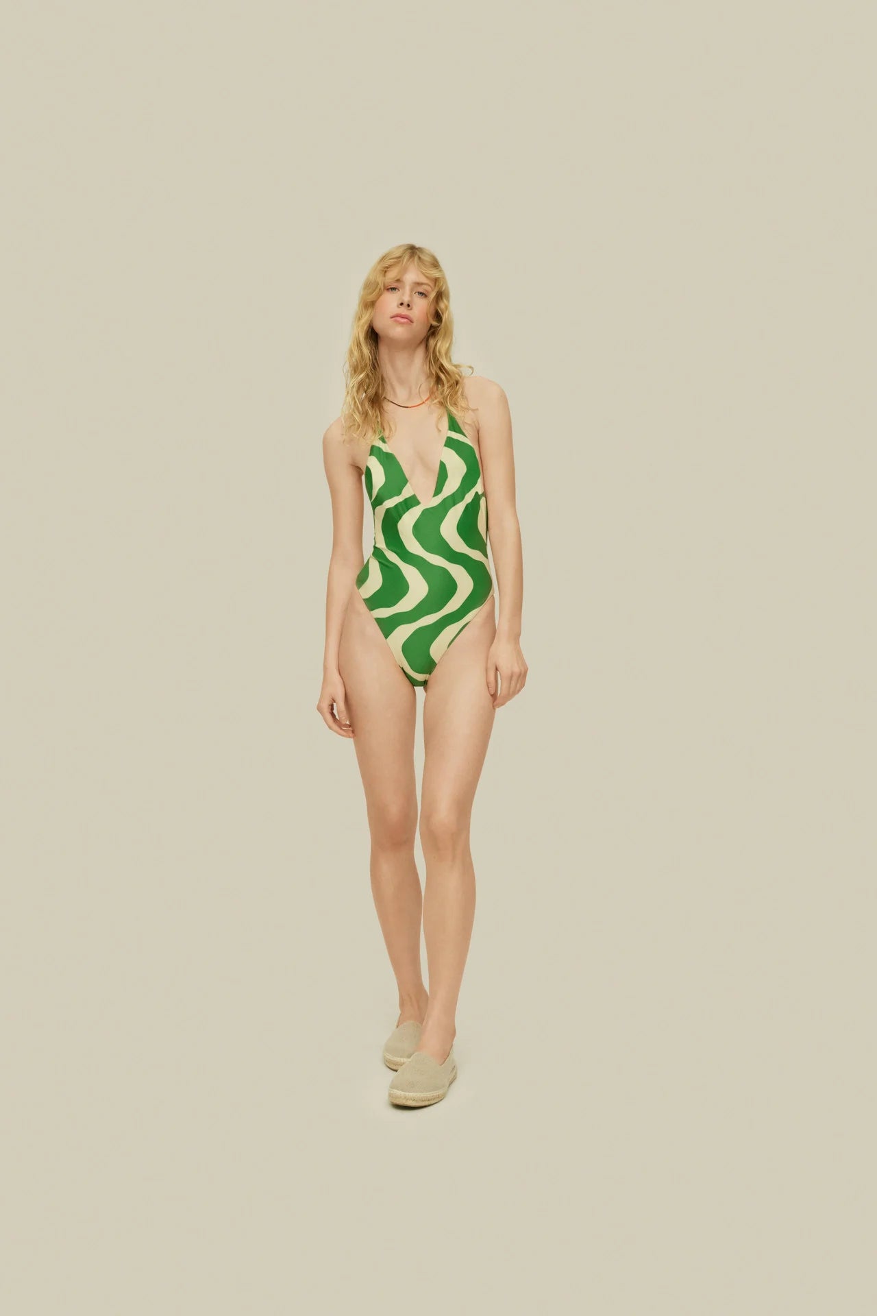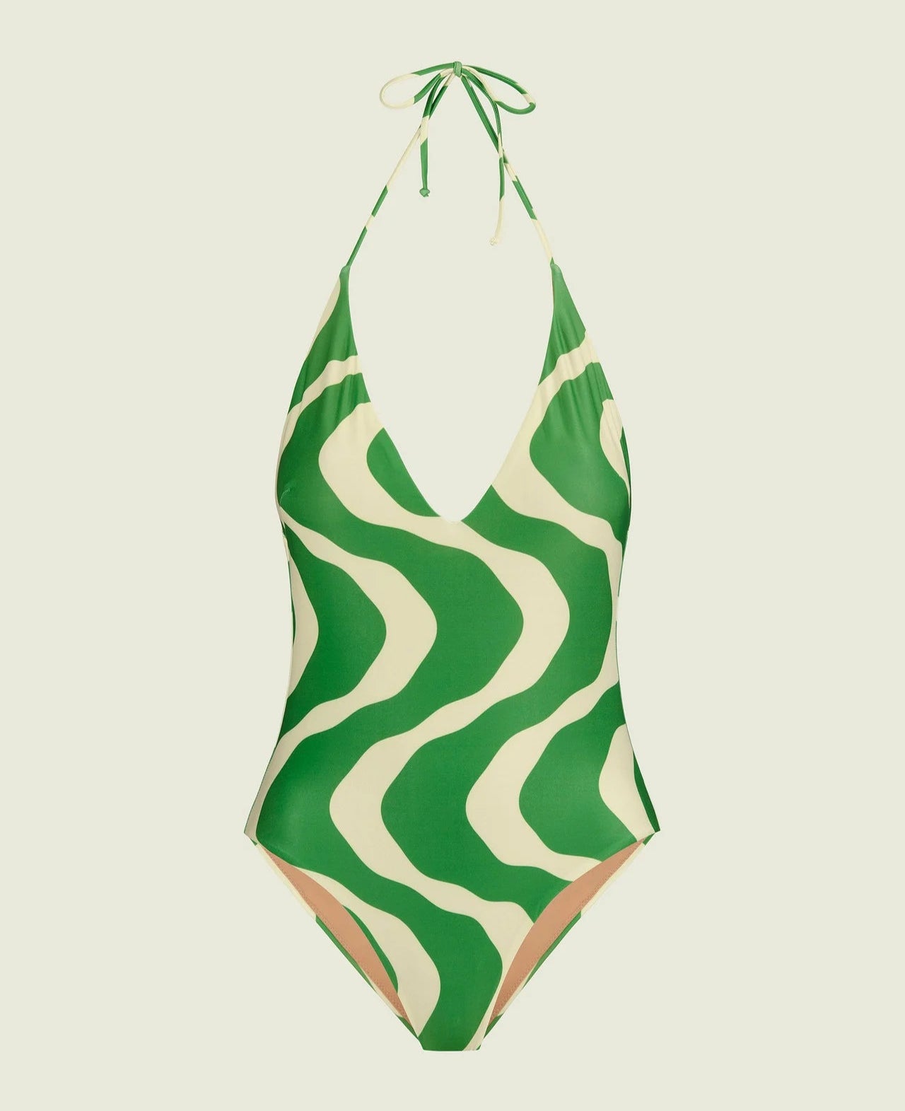 The Green Rippling Lido Bathing Suit is a plunging halterneck silhouette with adjustable ties, adorned with playfully swirling stripes. It has a low-slung back and high-cut sides to elongate your legs. Made from an UV-protective stretch fabric with a soft sheen, containing recycled polyester sourced from ocean waste. Fully lined.