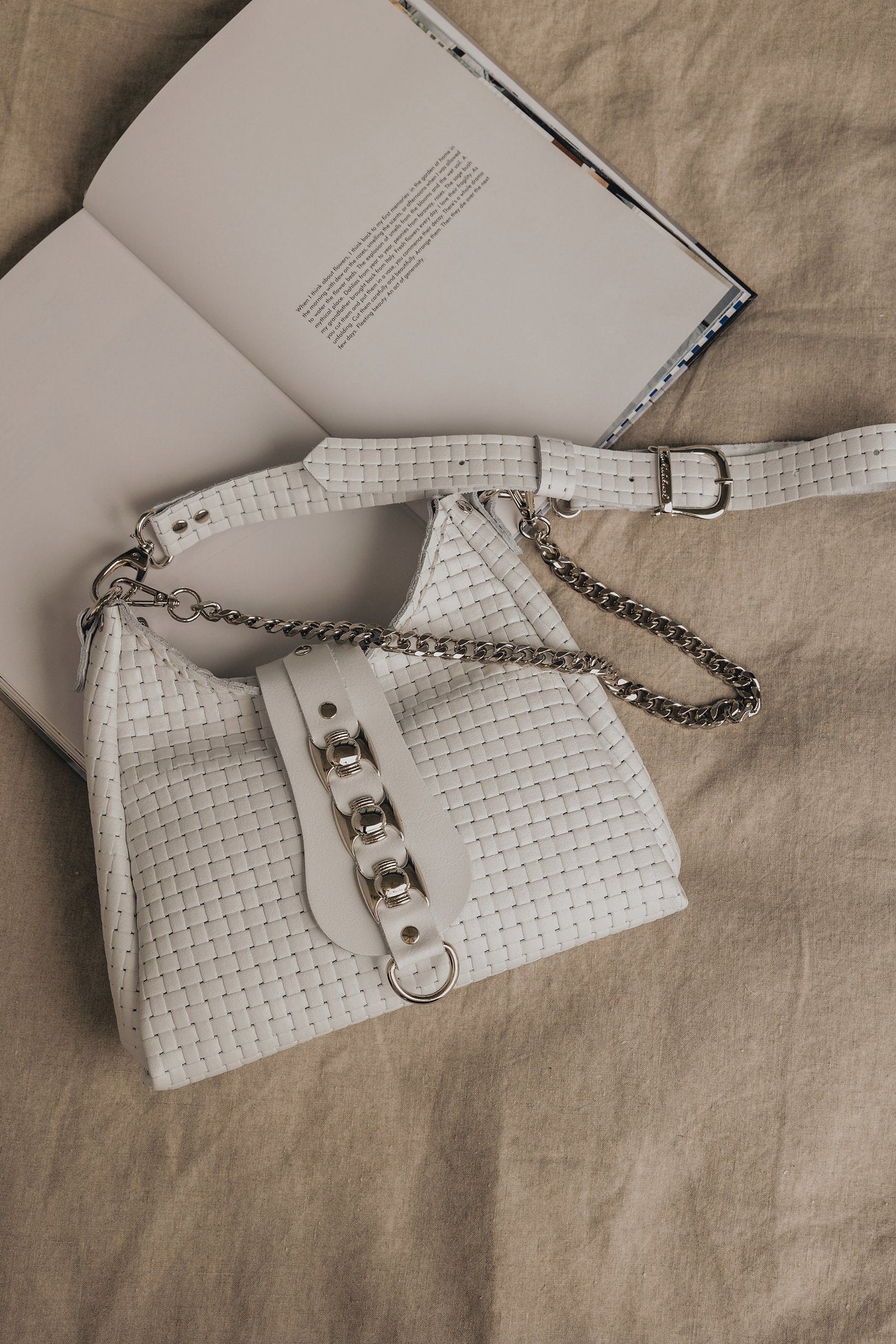 Handcrafted leather bag with nickel metal details. Comes with double strap. One adjustable leather strap and one chain strap. Comes with removable leather wallet.