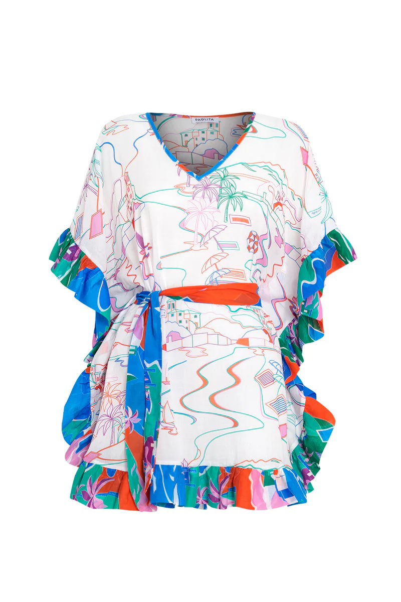 Expertly crafted with lightweight 100% cotton, the Isla Bonita Tulum Kaftan is perfect for any beachfront outing. Its relaxed fit, ruffle hem, and butterfly silhouette provide both comfortable and a flattering look. Comes with a detachable belt for versatile styling options.