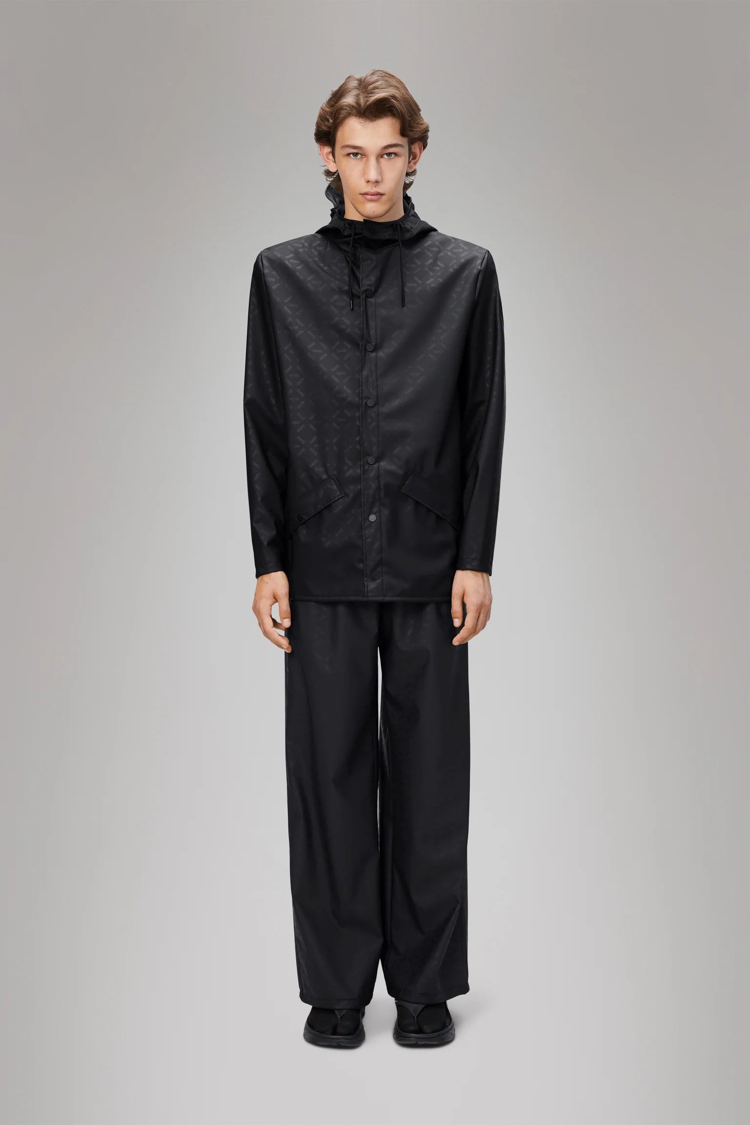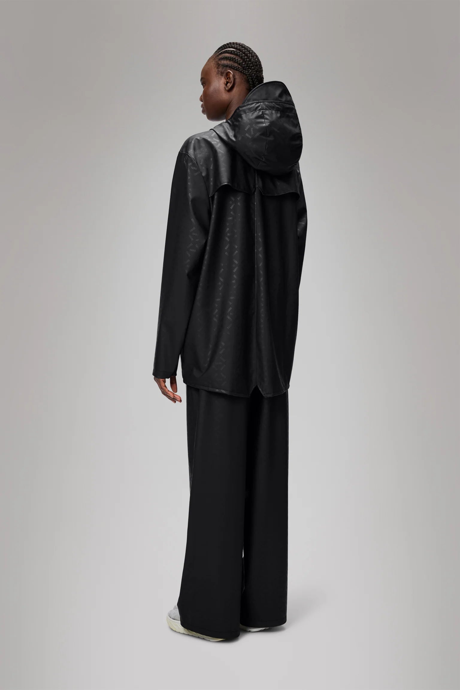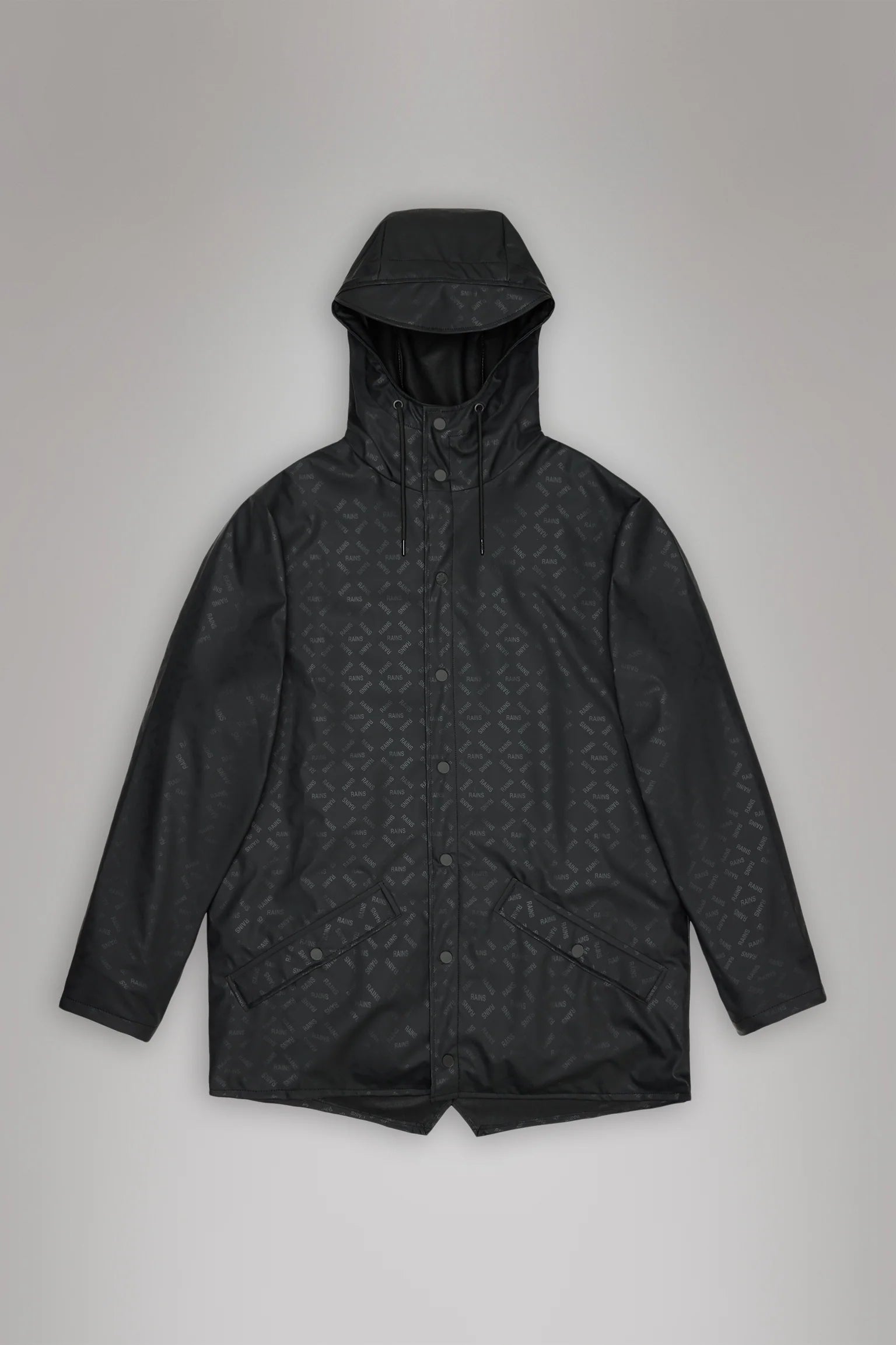 Jacket is cut from Rains' signature PU fabric and features welded seams. The finish is lightweight with a smooth feel.