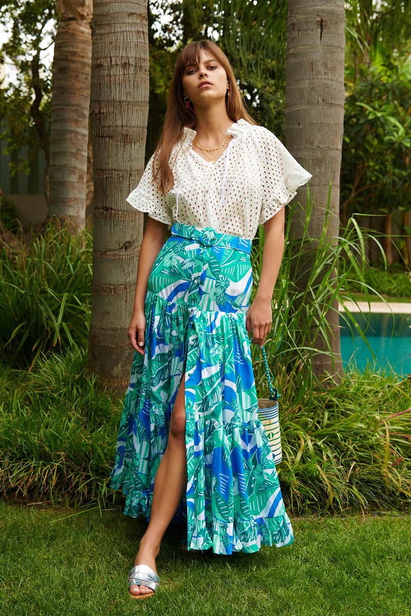The Lido White Majorca Top features a relaxed blouse silhouette, crafted from lightweight cotton for comfortable wear. With ruffle sleeves and a pleated V-neckline, this top delivers both style and comfort.