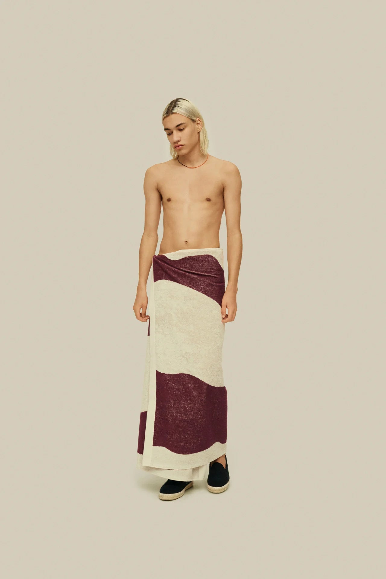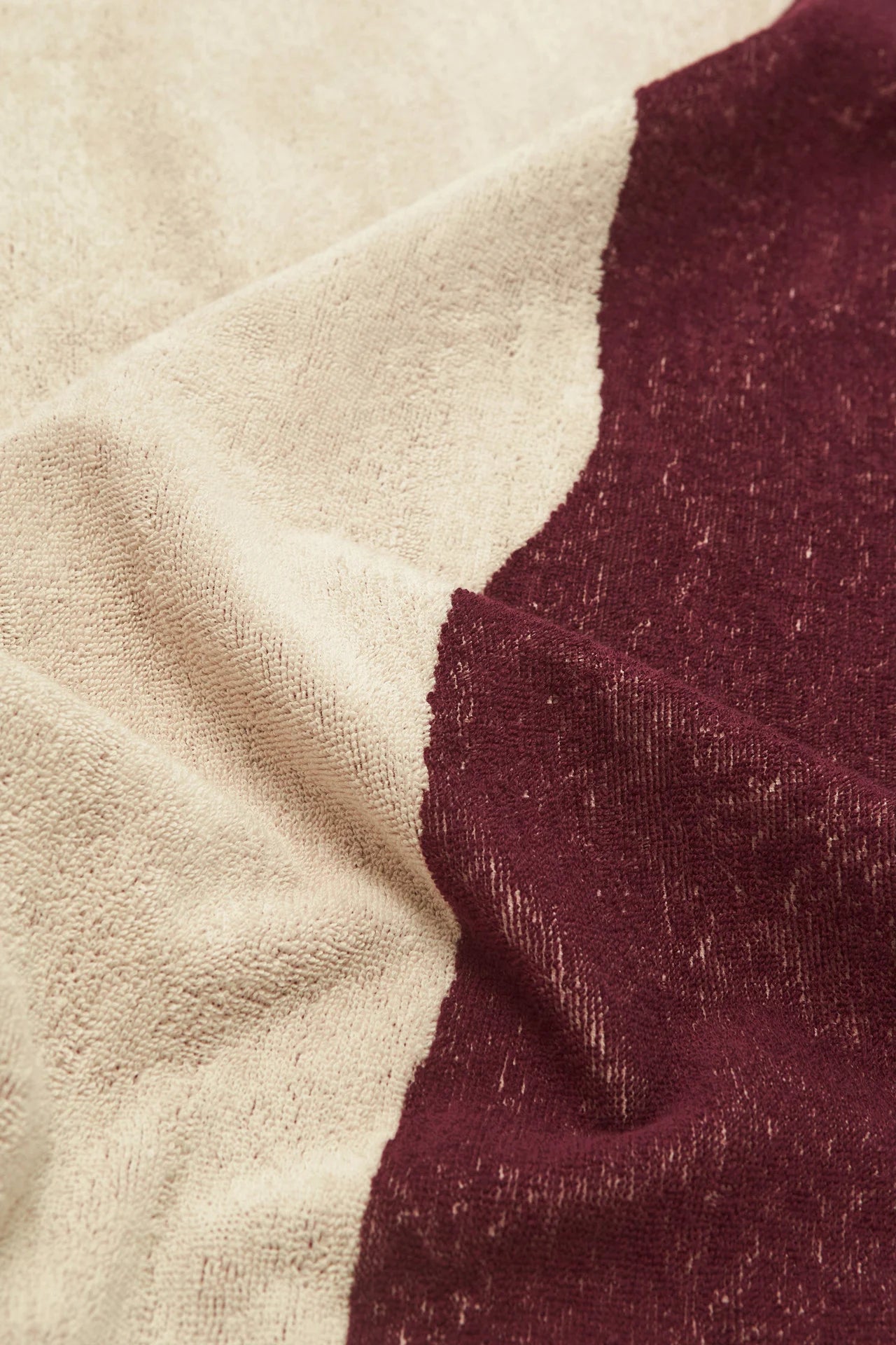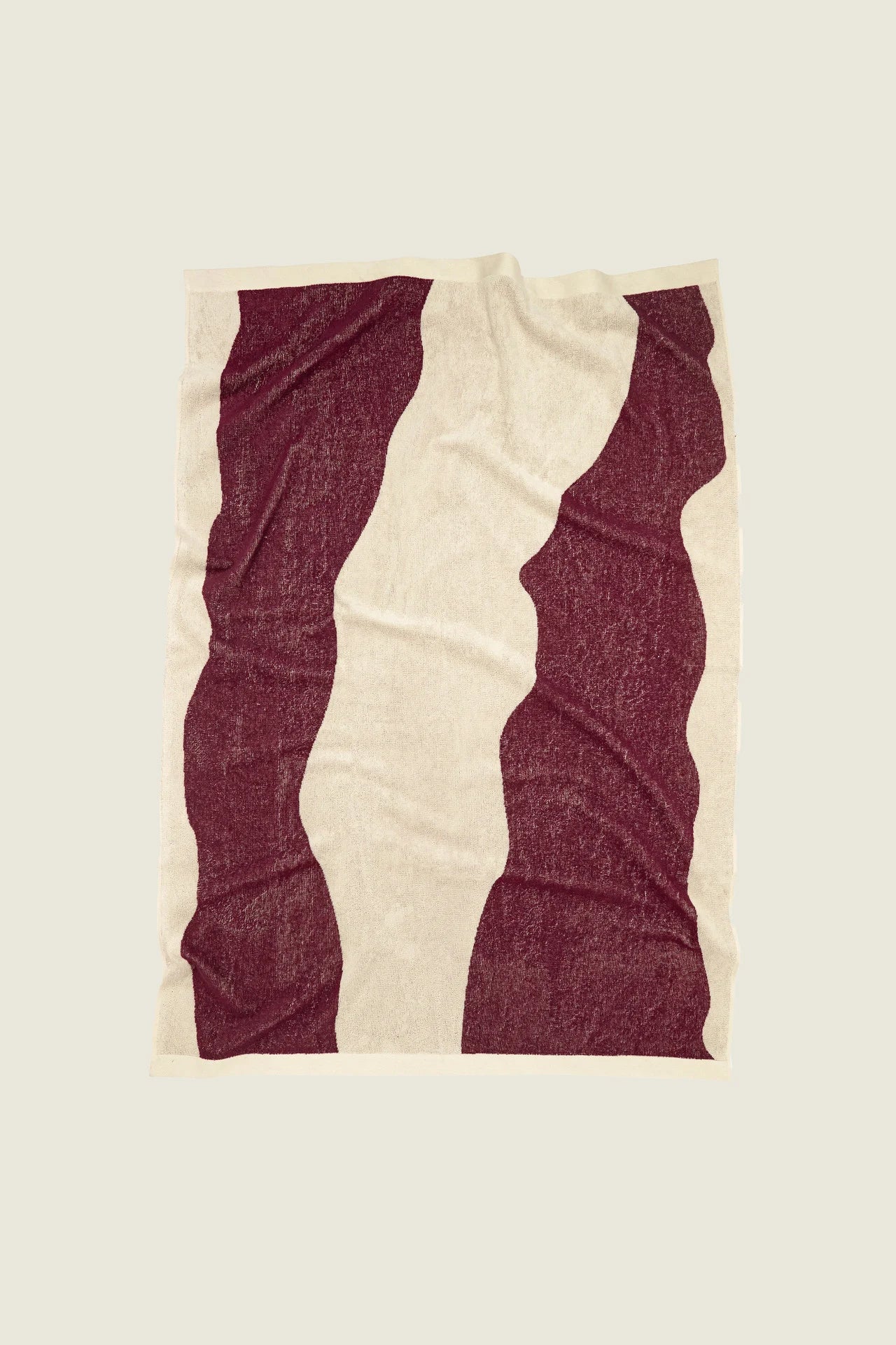 The Burgundy Bone towel envelops the body in sumptuous, highly absorbent cotton-terry that's jacquard-woven with a scaled-up pattern evocative of rippling shorelines. With its generous size and plush feel, it provides comfort whether you’re lounging by the pool or drying up after a dip in the sea.