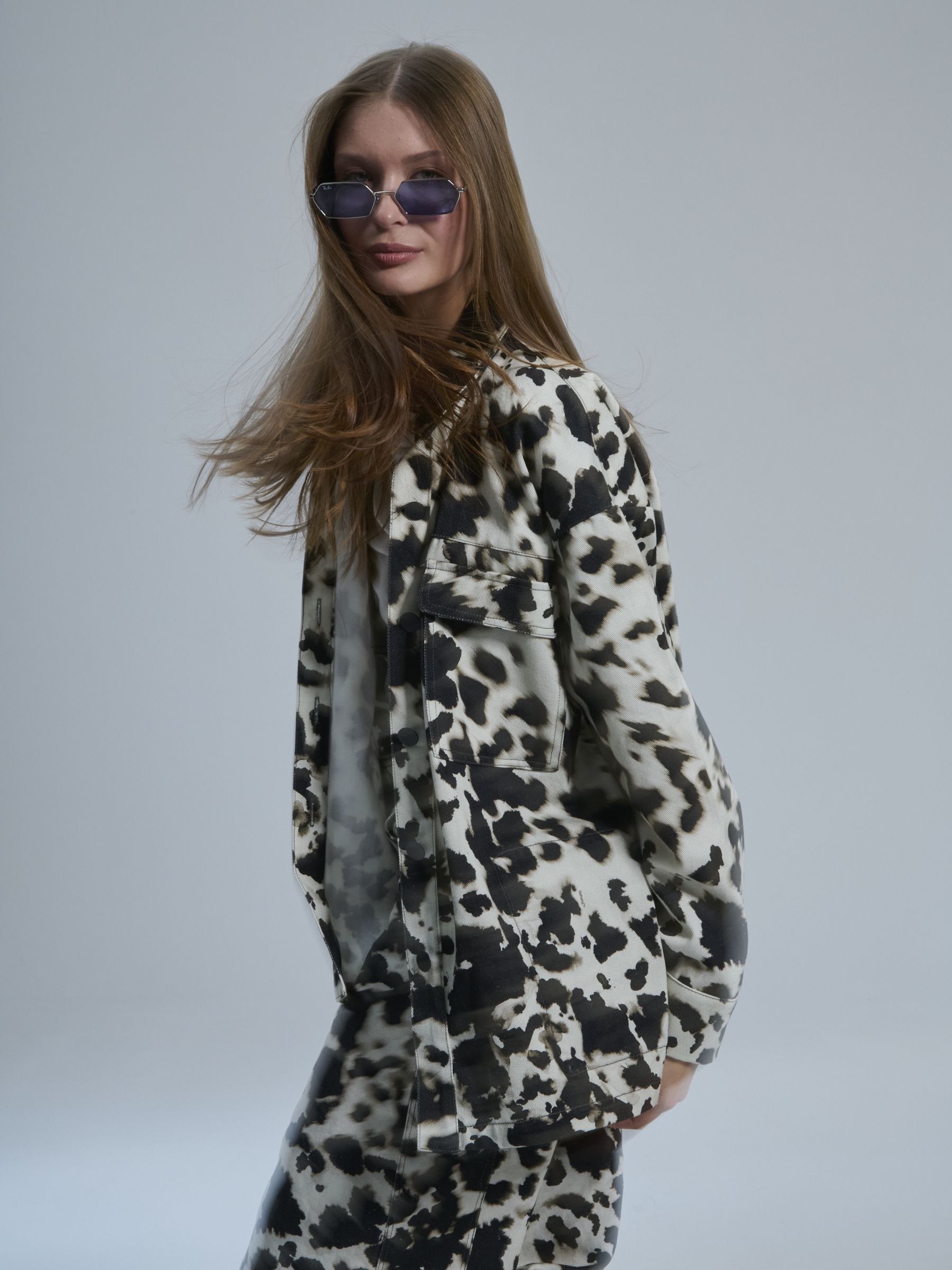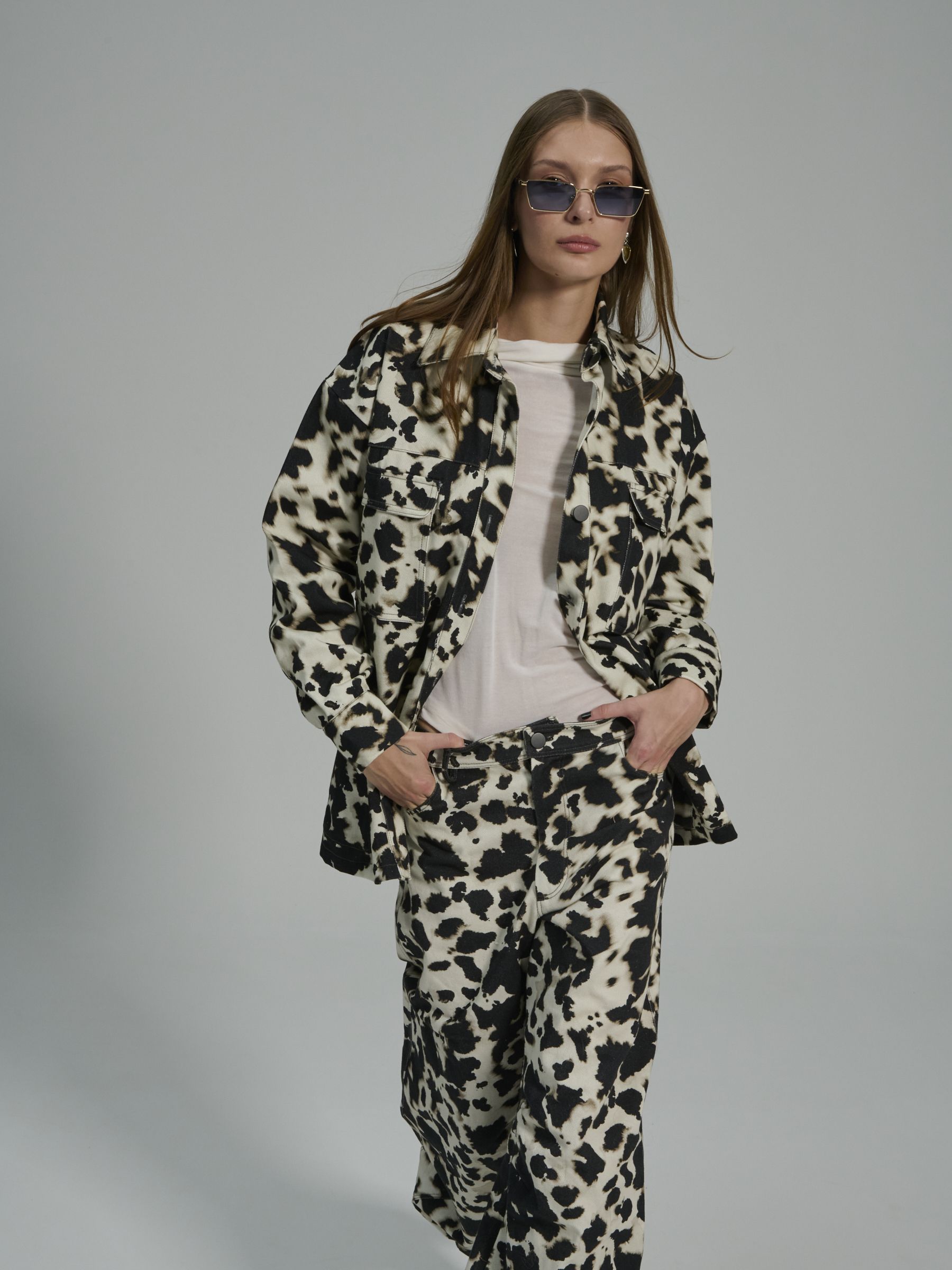 The PROJECT SOMA Leandra Jacket is mde of cotton bull denim fabric with a unique ink technique. An oversized, unisex shacket featuring external pockets.