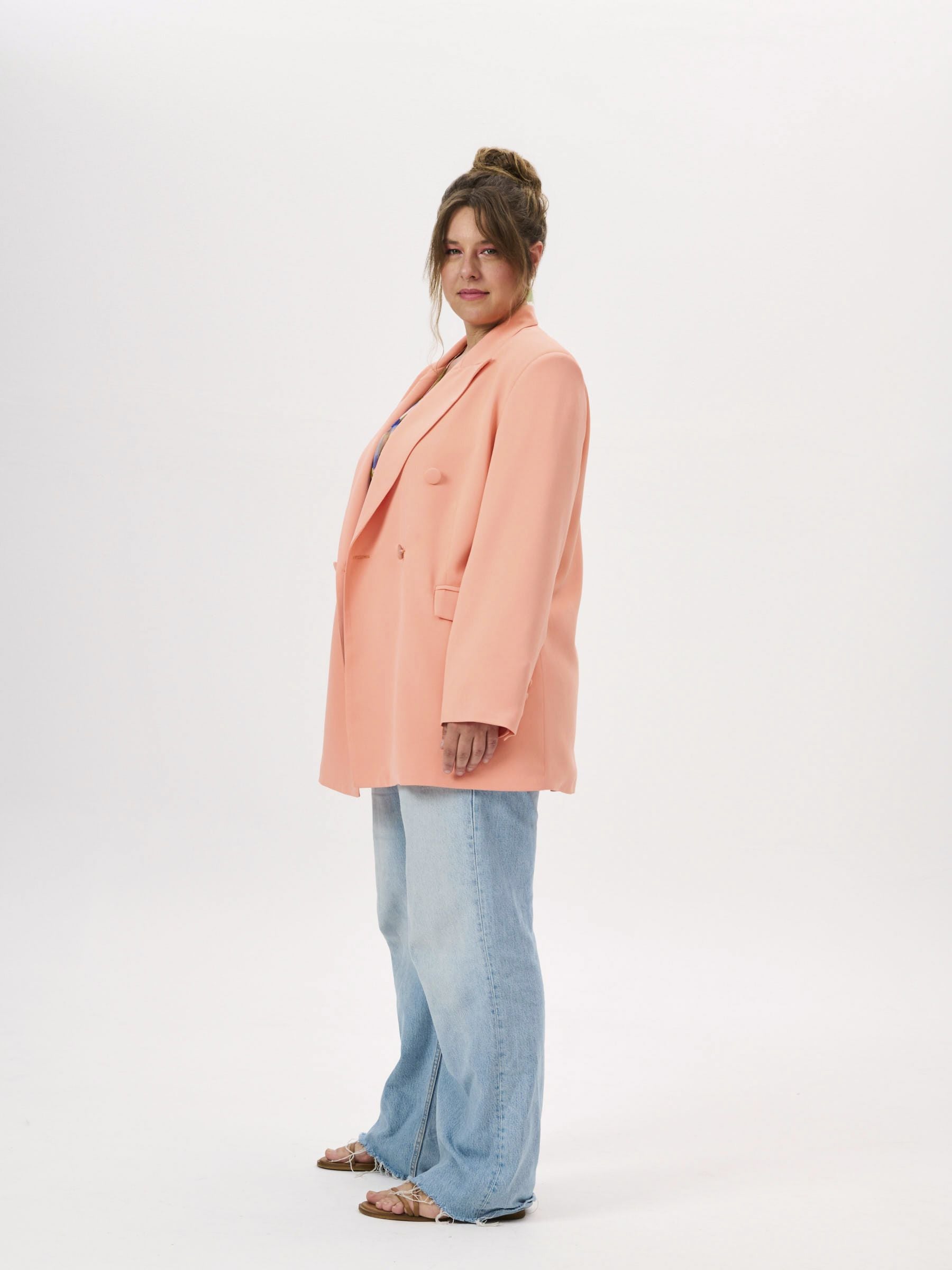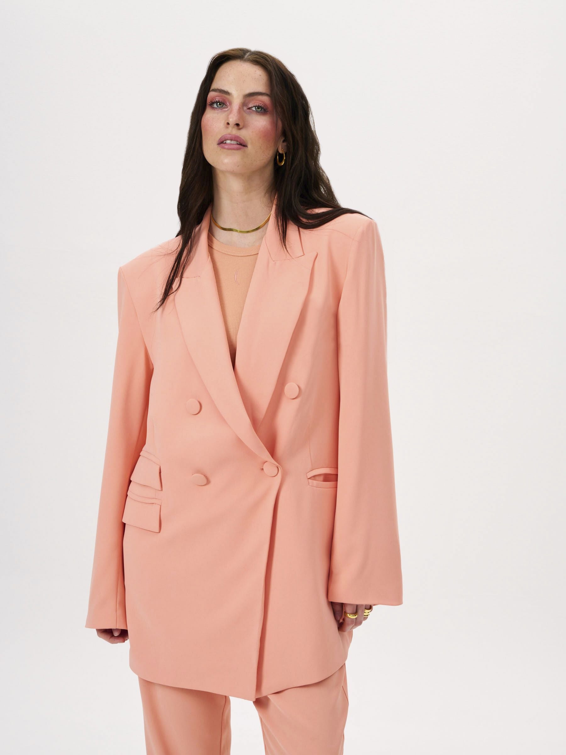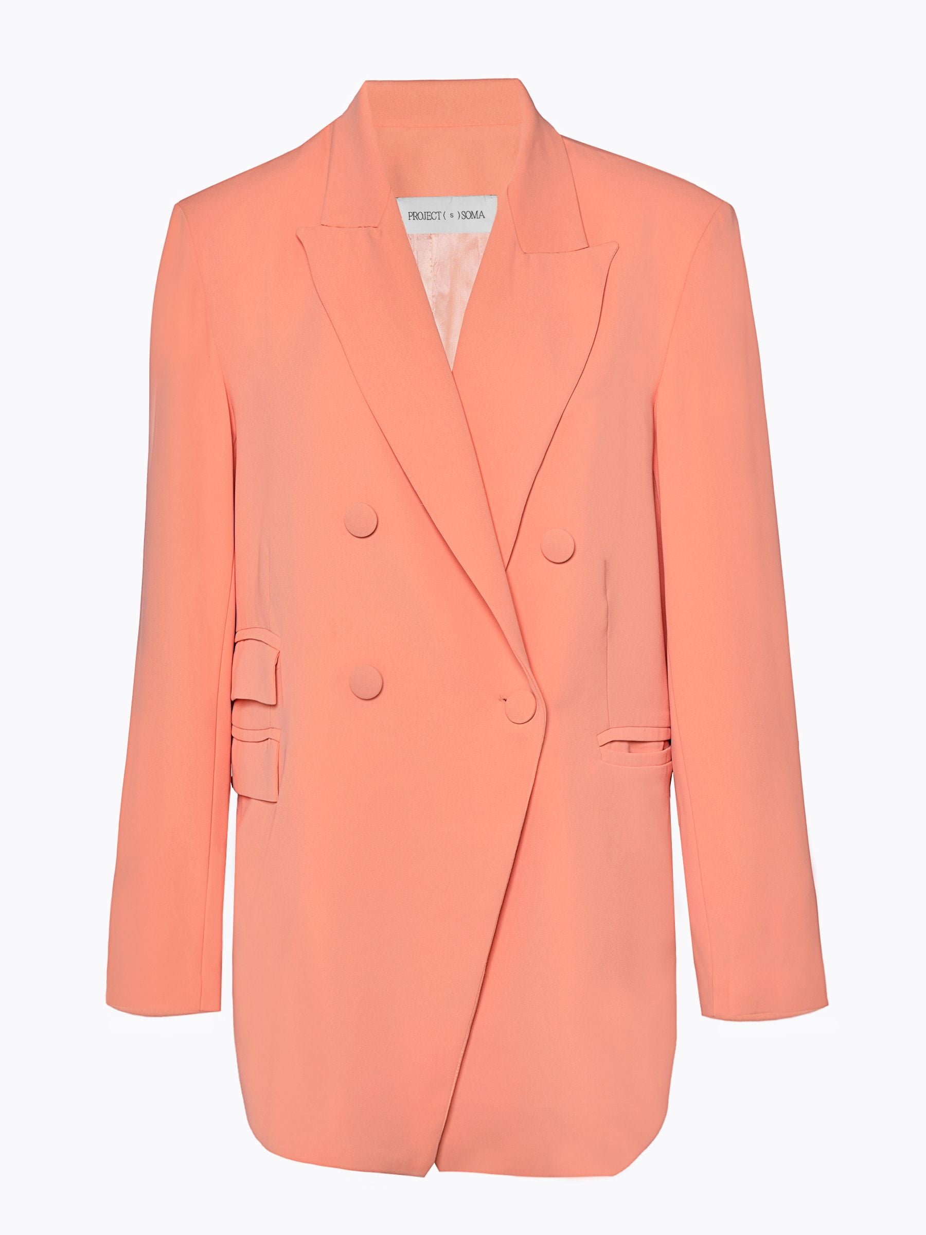 The PROJECT SOMA Oriana Peach Blazer is made of solid-colored suit crepe fabric. An oversized, double-breasted blazer.