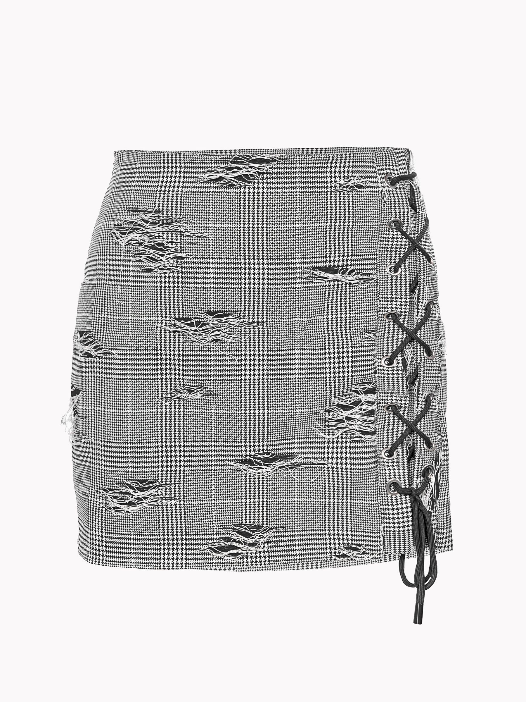 The PROJECT SOMA Orsola Skirt is made of a distinctive black-and-white fabric with distressing details. A mini skirt featuring studs and a tie closure.