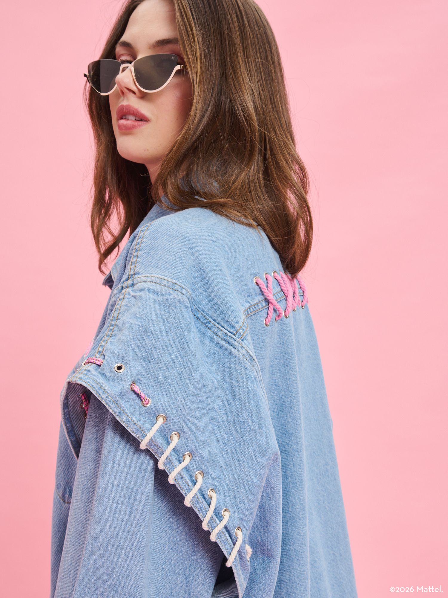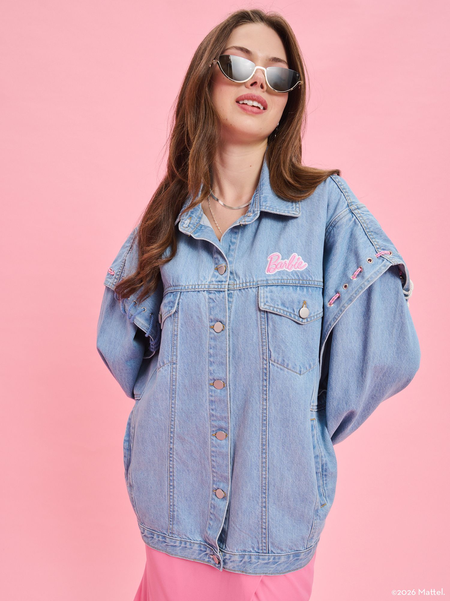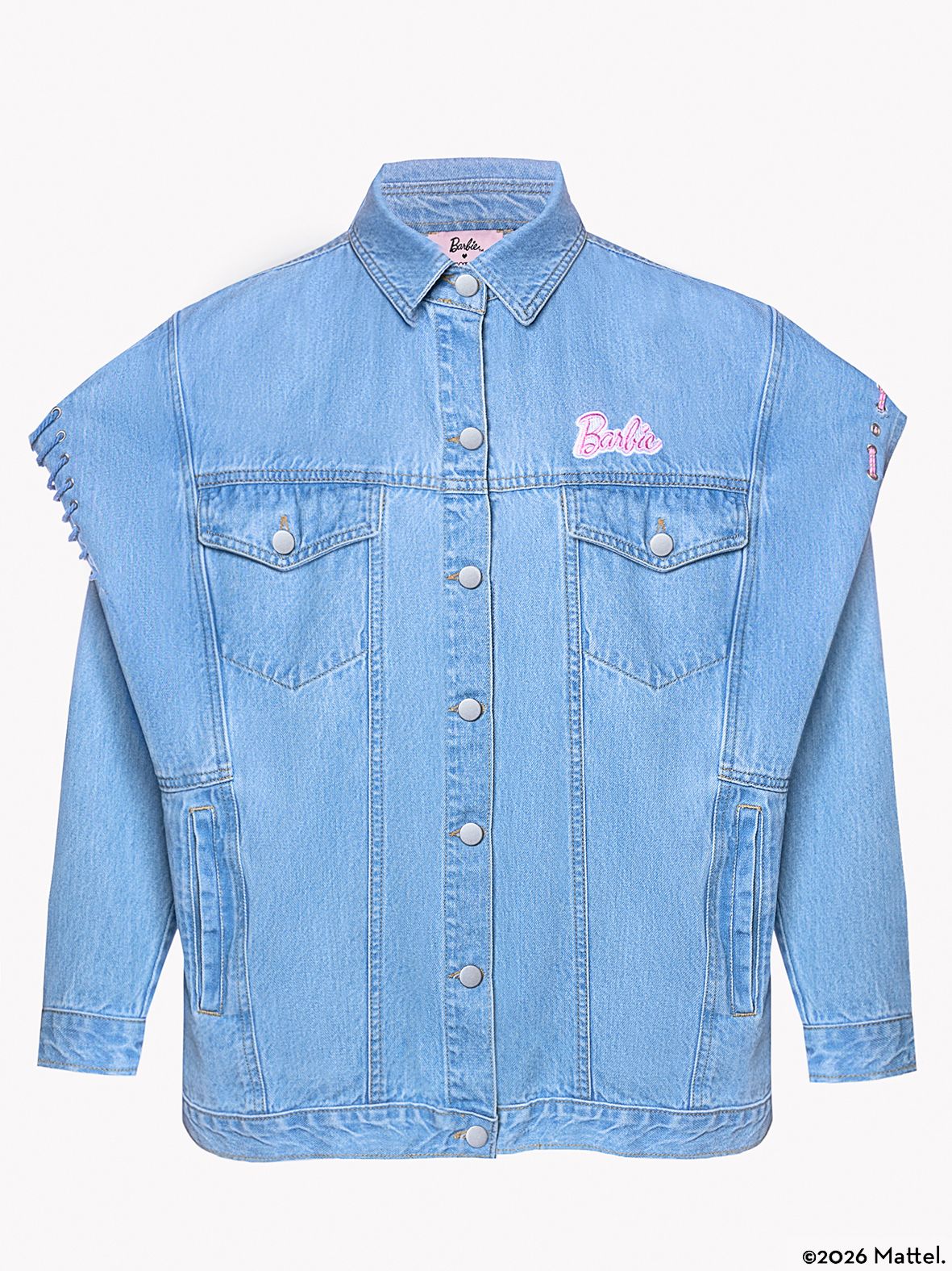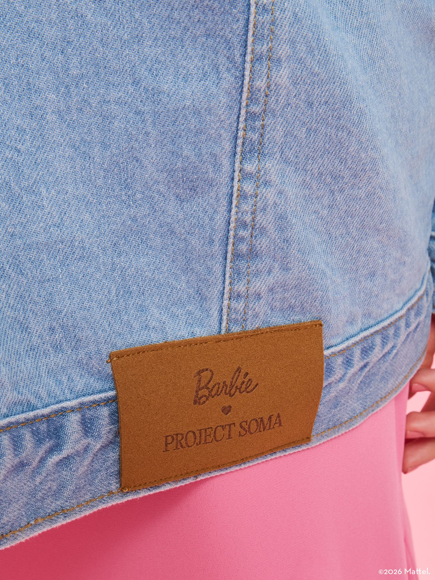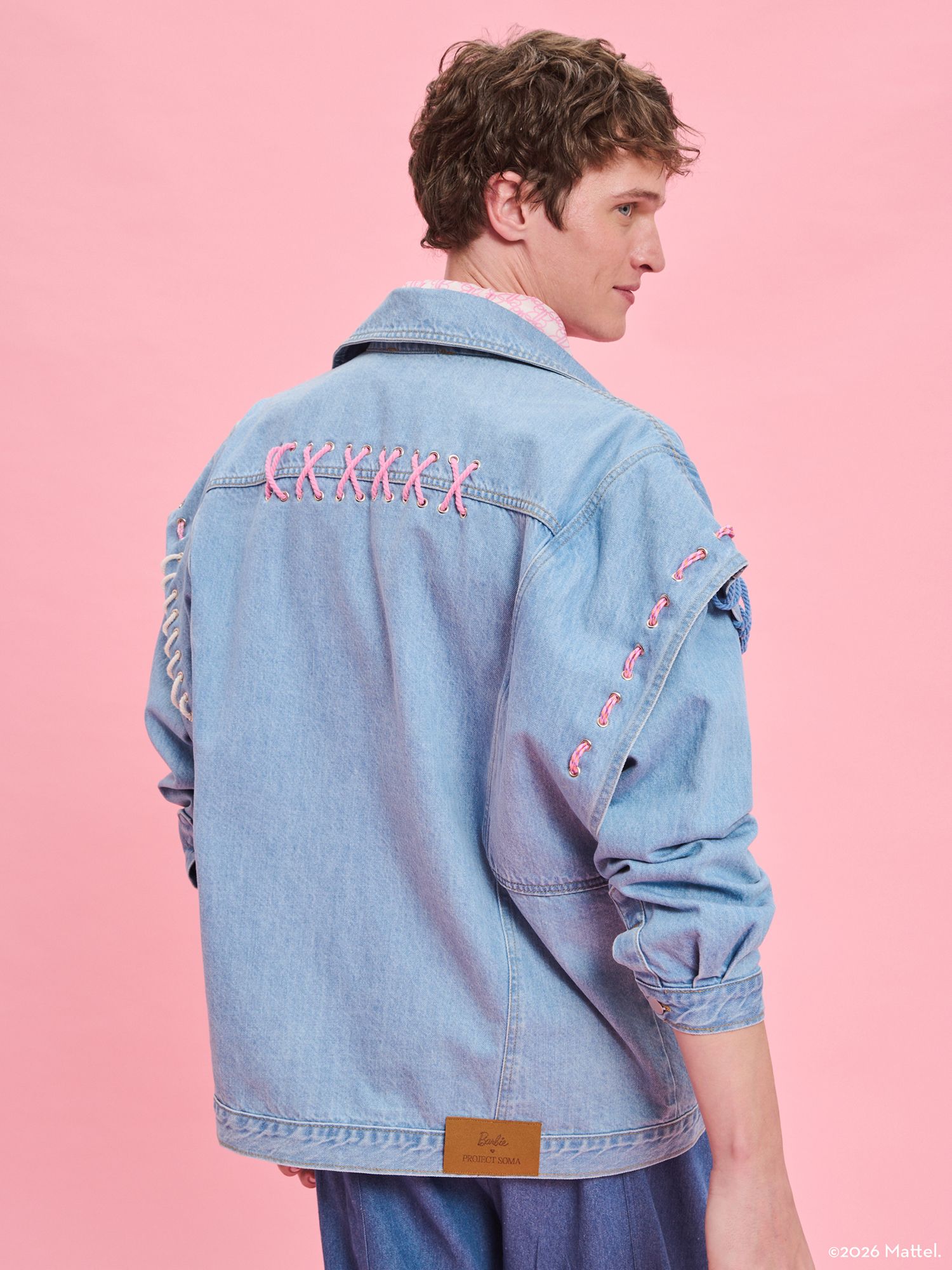The Barbie X Project Soma Iconic Jacket is crafted from organic cotton denim fabric. Oversized denim jacket featuring stud details and multicolored cord accents.