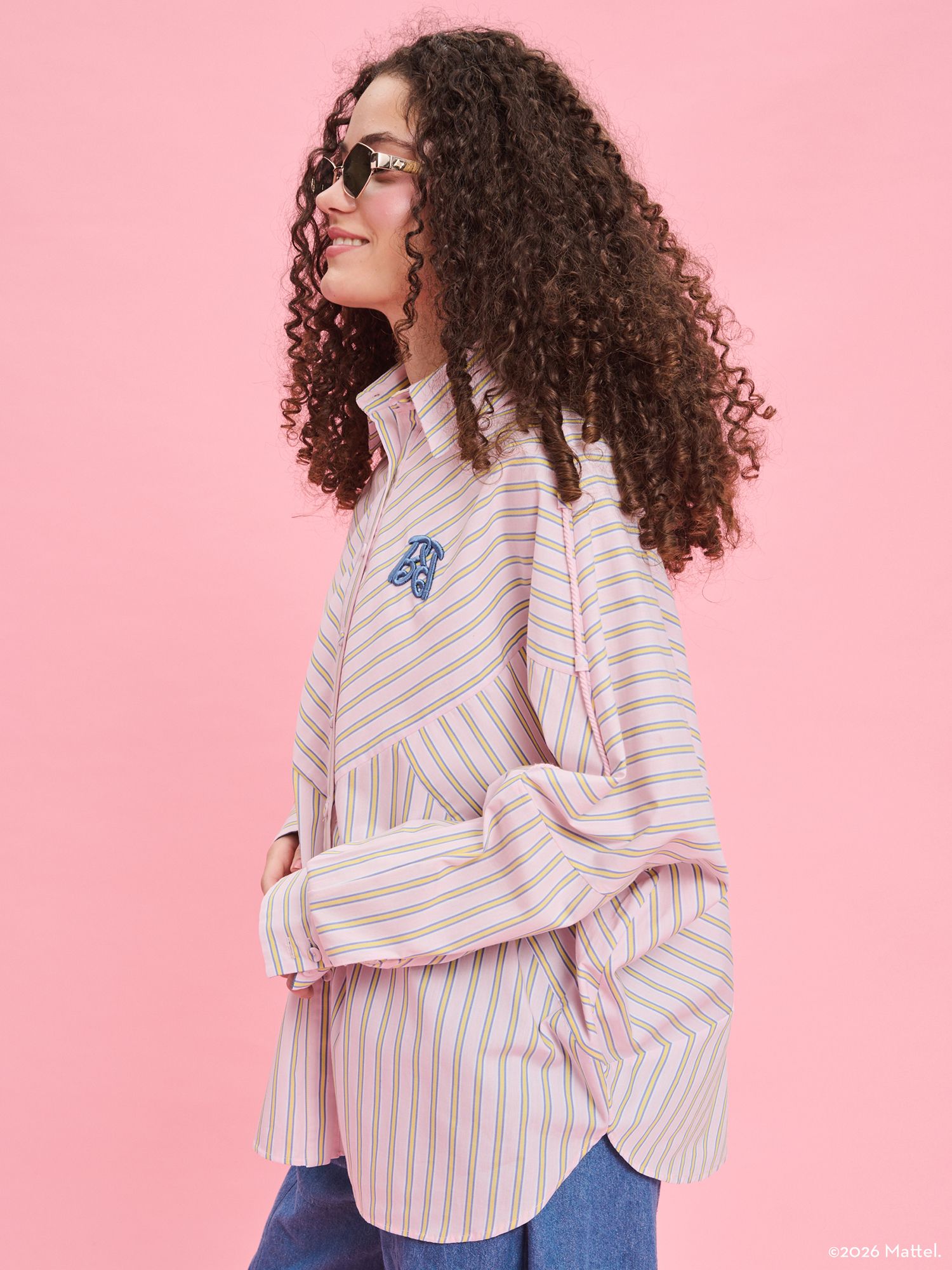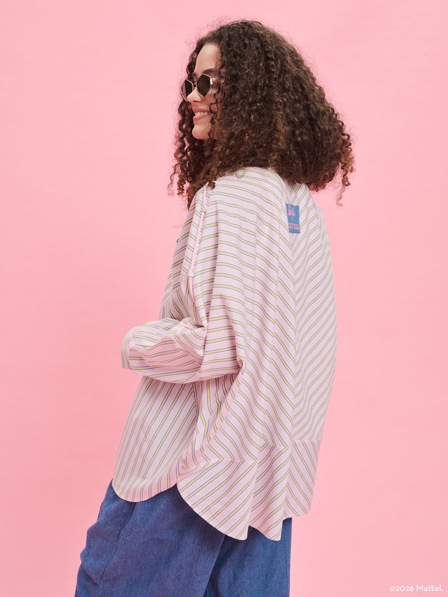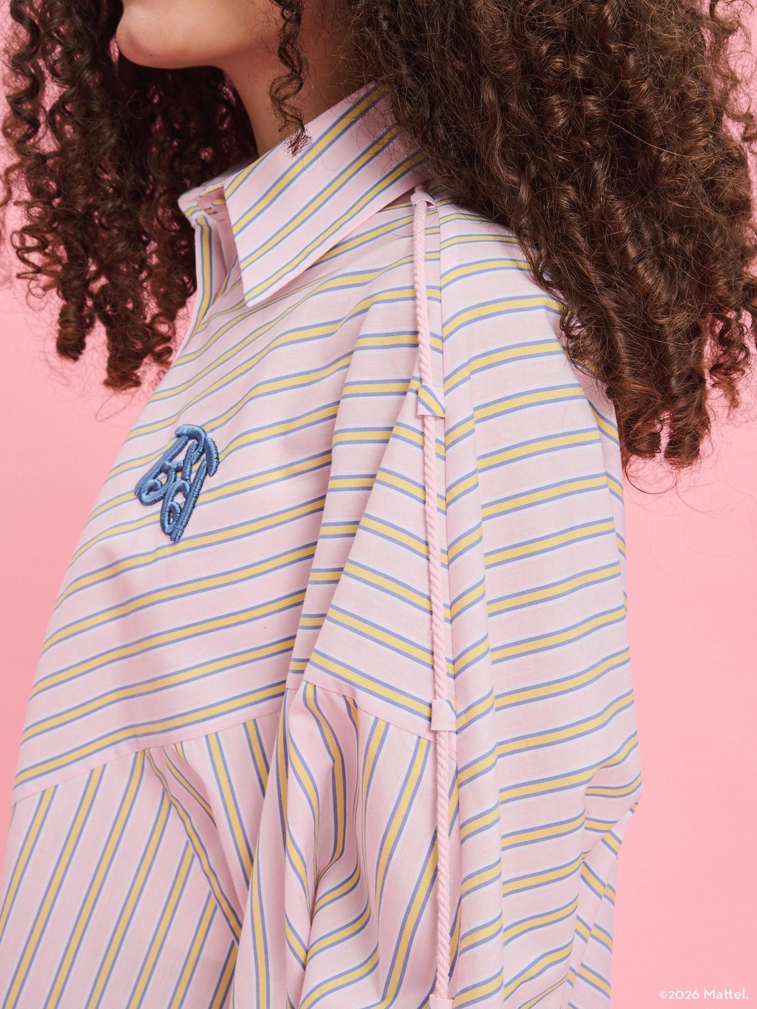 The Barbie X PROJECT SOMA Positivity Shirt is crafted from striped poplin fabric. Oversized shirt featuring decorative stitching and drawstring details on the shoulders.