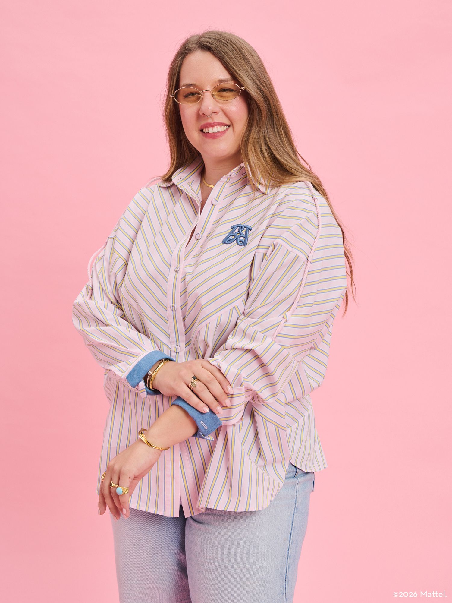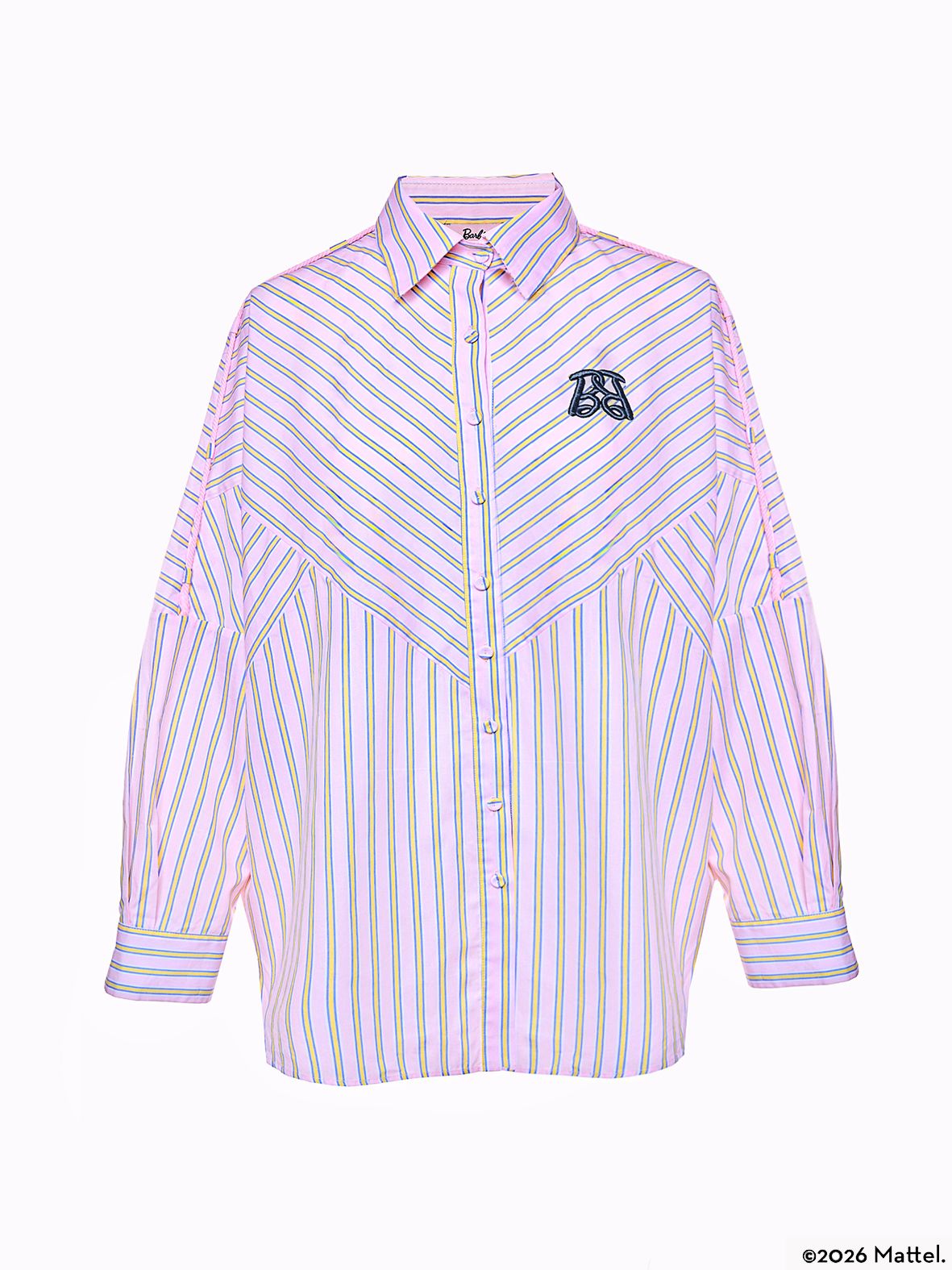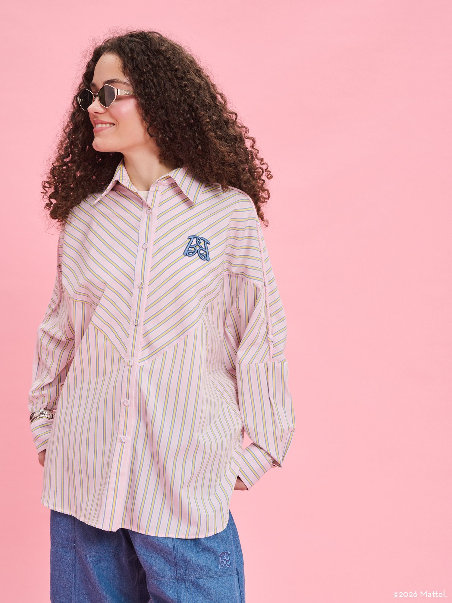 The Barbie X PROJECT SOMA Positivity Shirt is crafted from striped poplin fabric. Oversized shirt featuring decorative stitching and drawstring details on the shoulders.