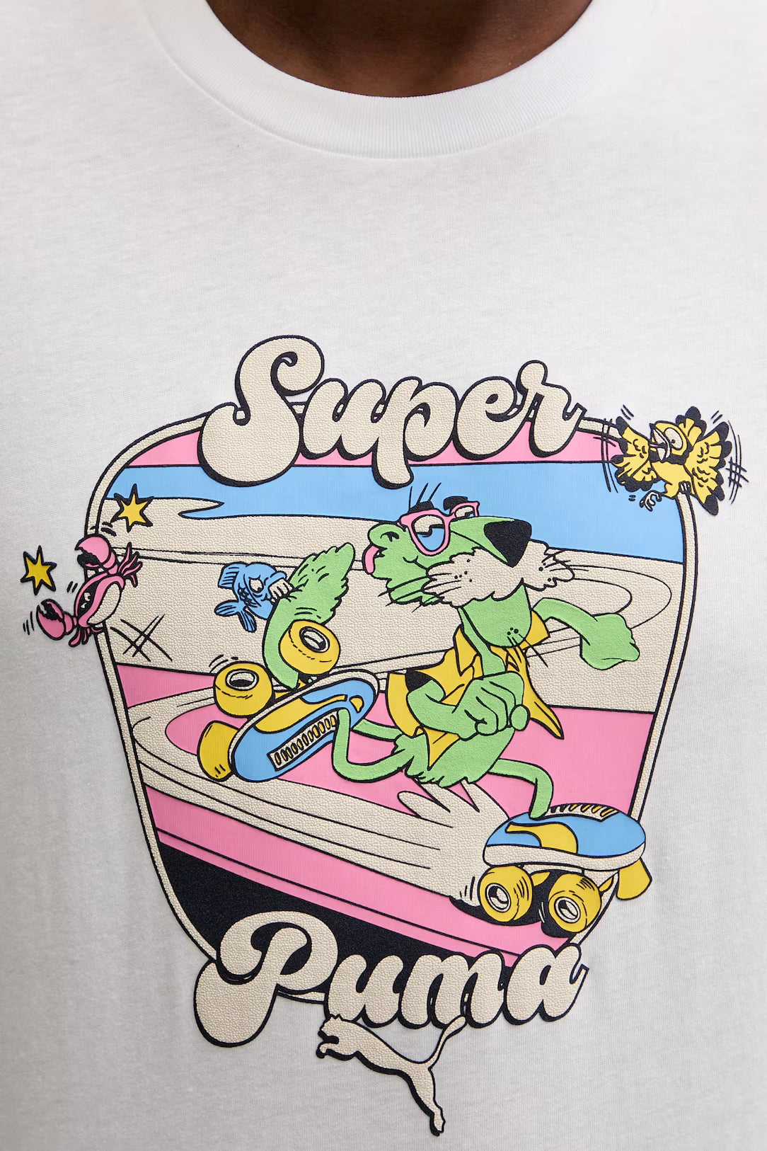 Add a playful retro touch to your streetwear rotation with the PUMA Super Graphic T-Shirt, available at ICONIC ANGELS. Designed in a clean white base, this statement tee features a bold, colorful “Super PUMA” graphic print that brings vintage-inspired energy to everyday styling.