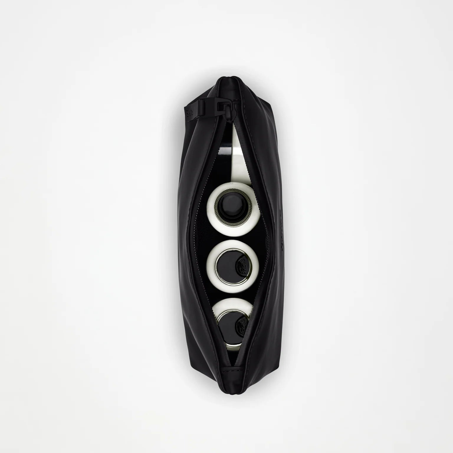 The design is characterized by its minimal silhouette, soft curves at the base and clean stitching at its opening. The bag is finished with a tactile TPU zip puller.