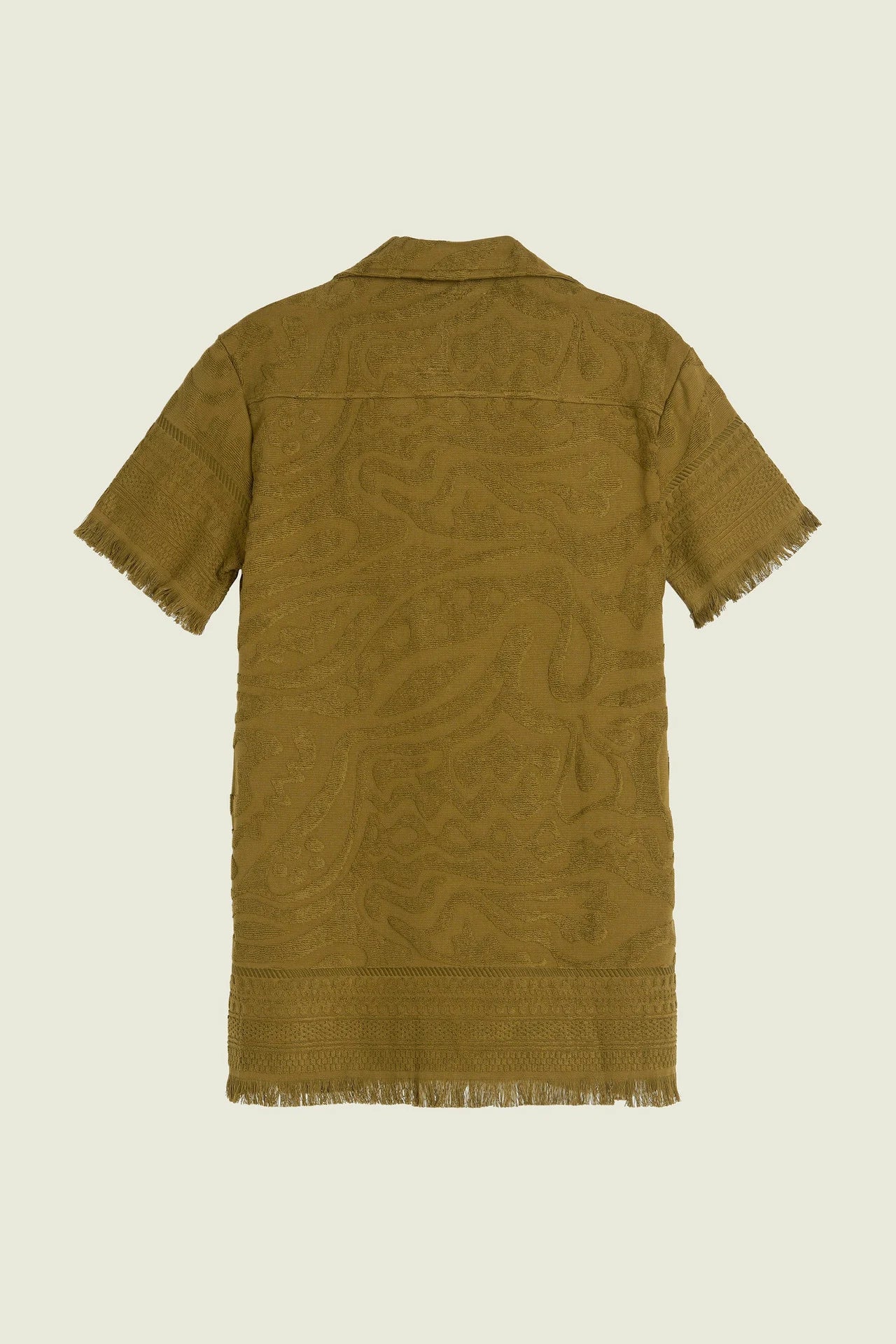 The Olive Aya terry dress is jacquard-woven to a hypnotic motif in midweight cotton terry that’s sumptuously soft and breathable. A relaxed silhouette designed with a deep open collar and traced with lush fringing at the cuffs and hem.