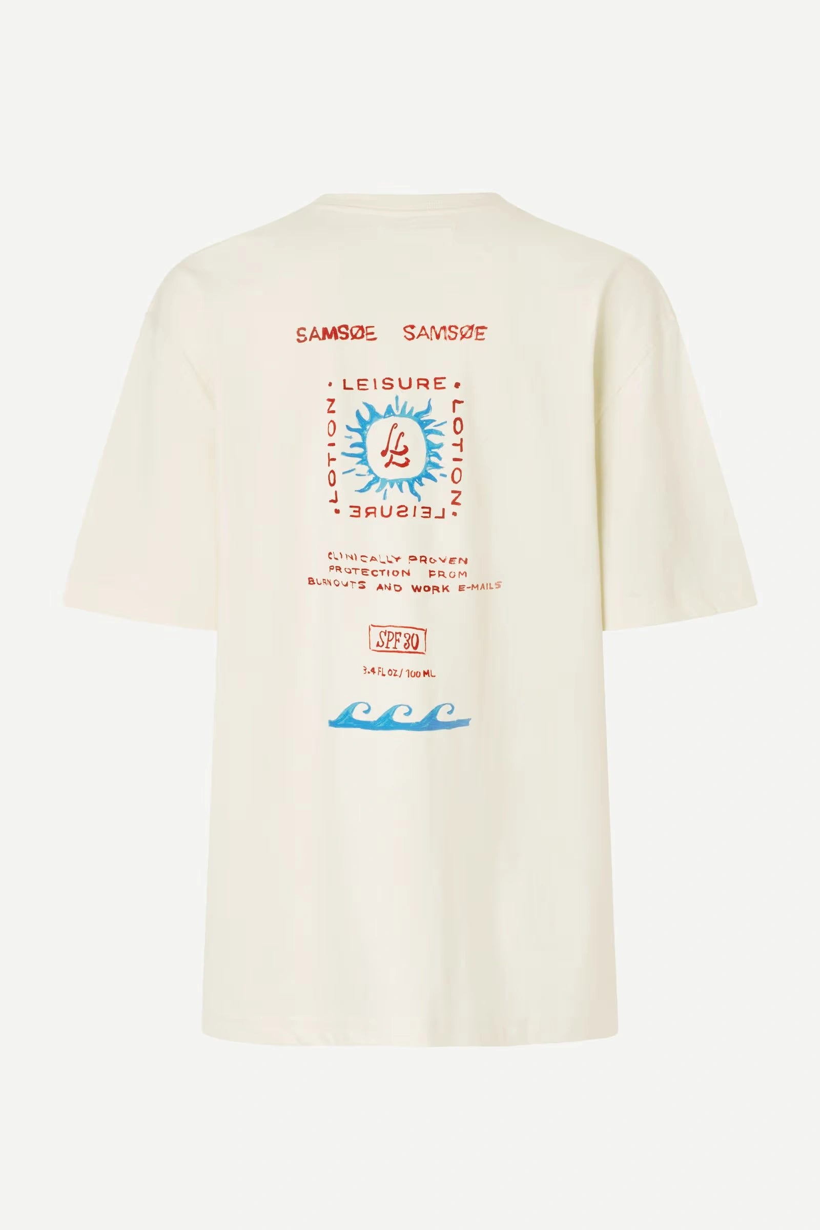 Short-sleeved jersey T-shirt with a regular fit and dropped shoulders. Rib-knitted crew neck. Printed graphic at the chest and printed Samsøe Samsøe branding on the back. Main material made from a blend of recycled cotton and organic cotton.