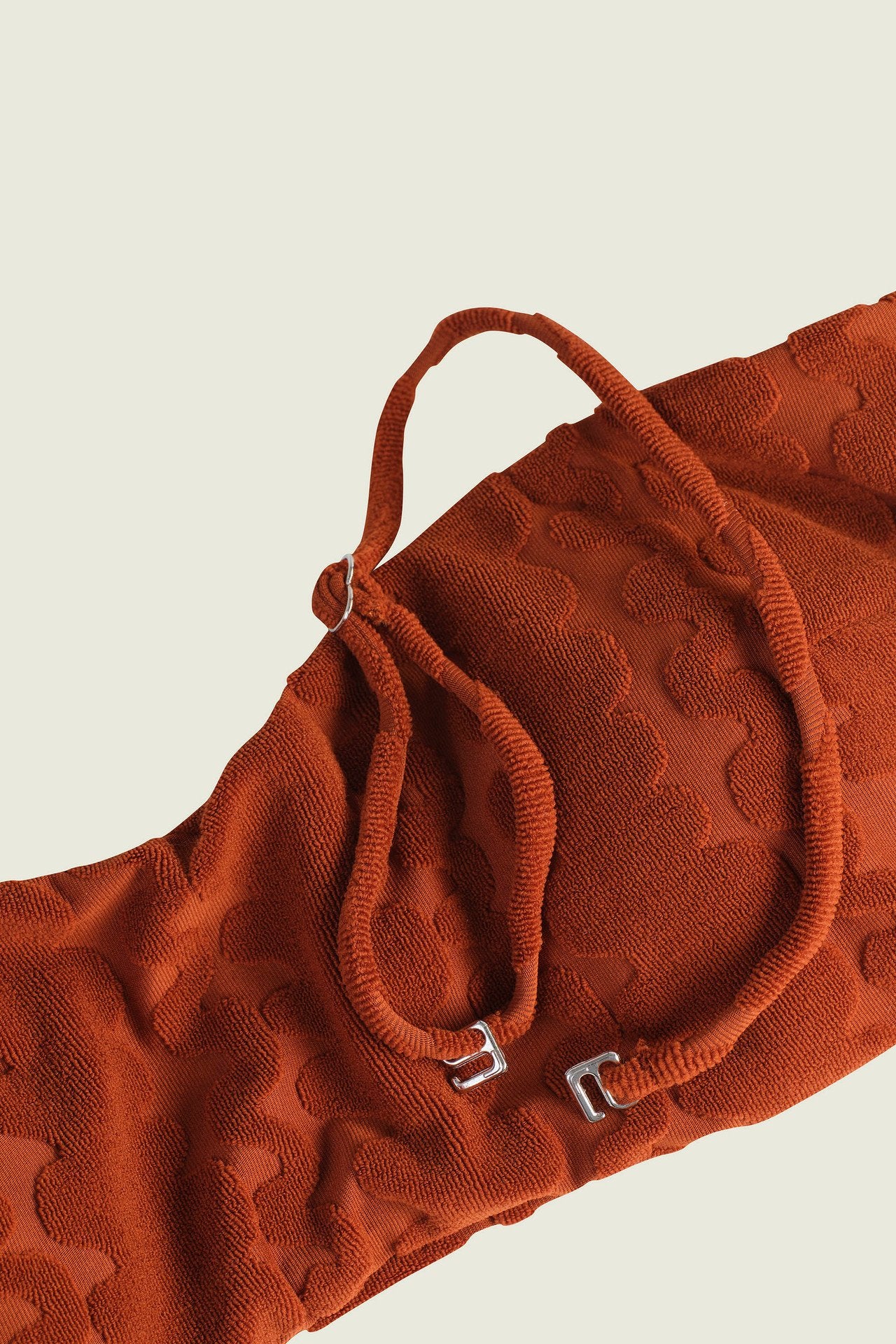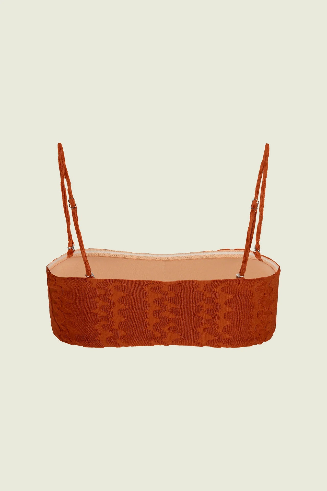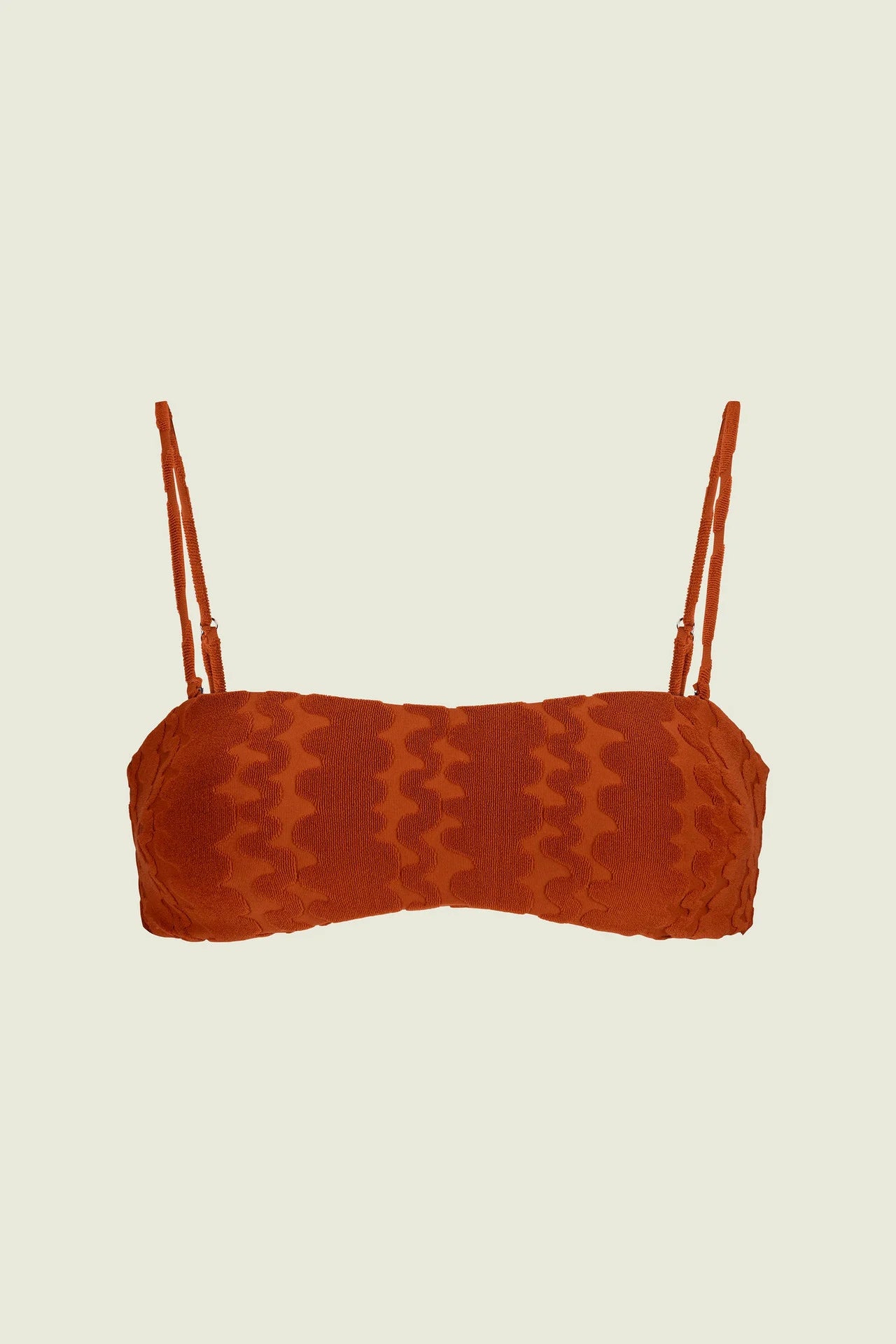 Terracotta Scribble Baia Bikini Top is jacquard-woven in swim terry featuring textural waves reminiscent of sandy shores. A structured bandeau silhouette with a silicone trim inside and optional spaghetti straps. Fully lined with removable cups offering gentle support.