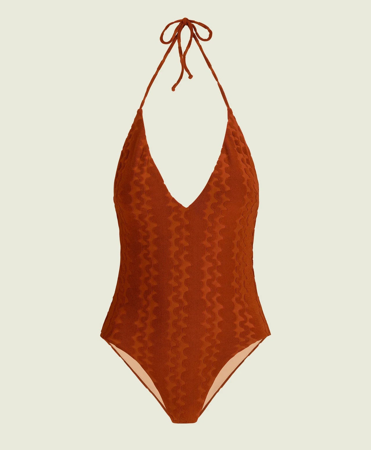 The Terracotta Scribble Lido Bathing Suit is jacquard-woven in swim terry featuring textural waves reminiscent of sandy shores. Shaped with a plunging halterneck that ties at the neck, it has a low-slung back and high-cut sides to elongate your legs. Fully lined.